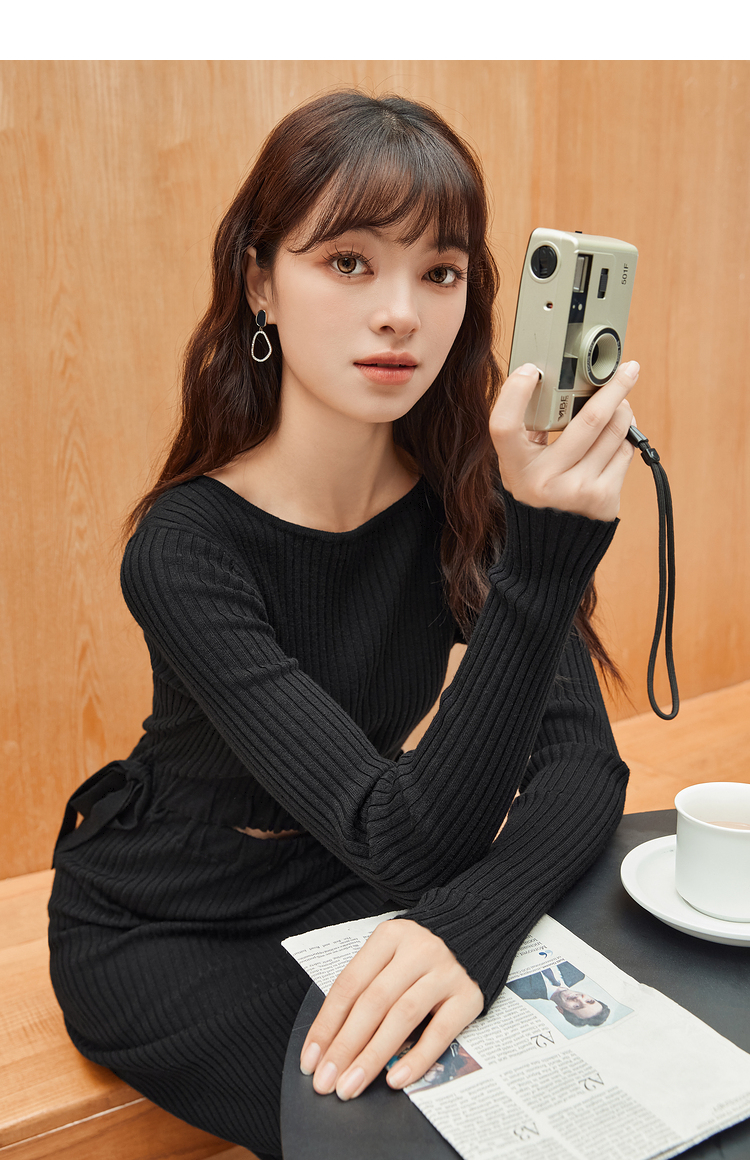 三福連衣裙2023秋氣質可調開叉腰部鏤空修身包臀長裙女473994