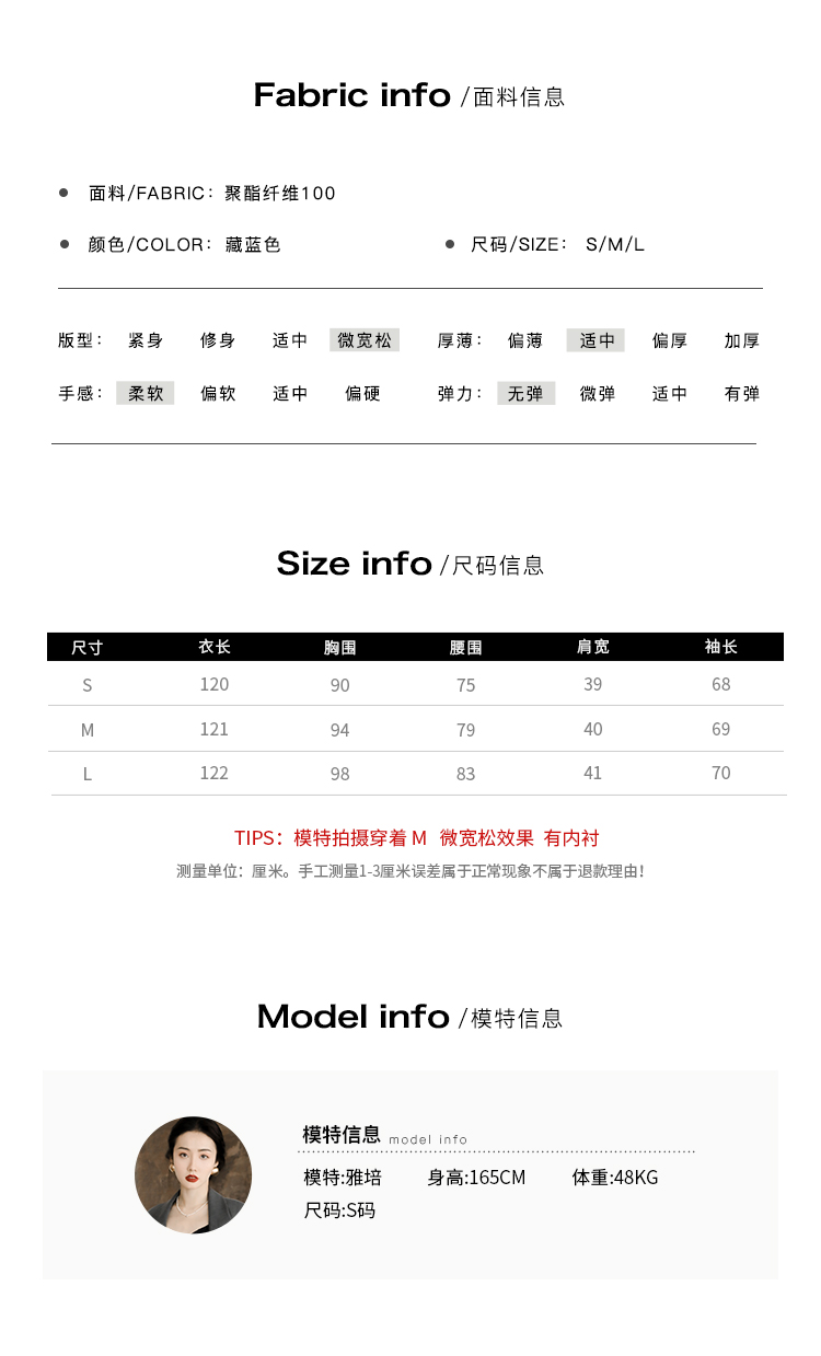 apozi深海藍褶皺長袖連衣裙女襯衫