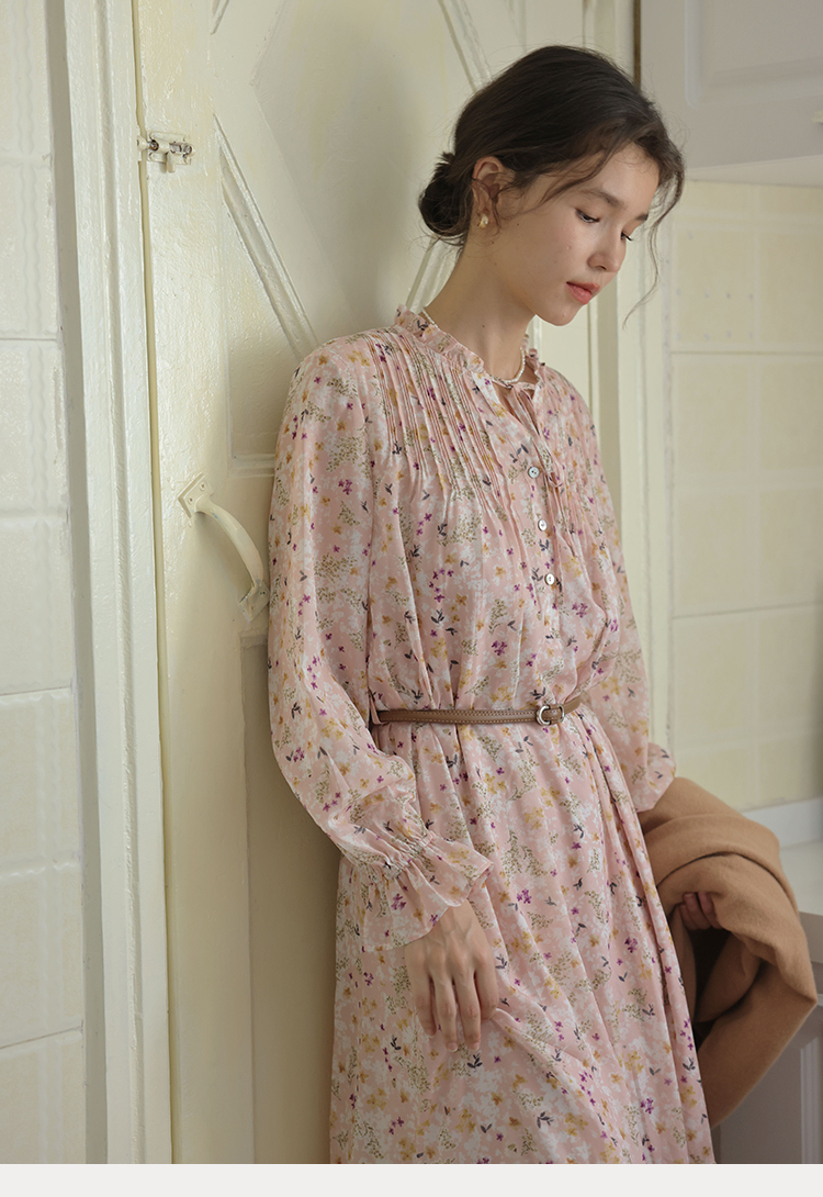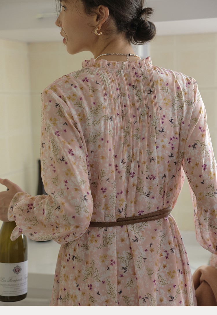 香影碎花長袖連衣裙女2023秋裝新款木耳邊立領通勤法式垂感雪紡裙