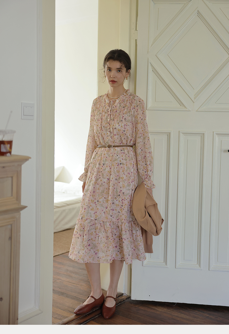 solighter 法式復古荷葉邊碎花連衣裙女秋季2023新款長袖氣質長裙