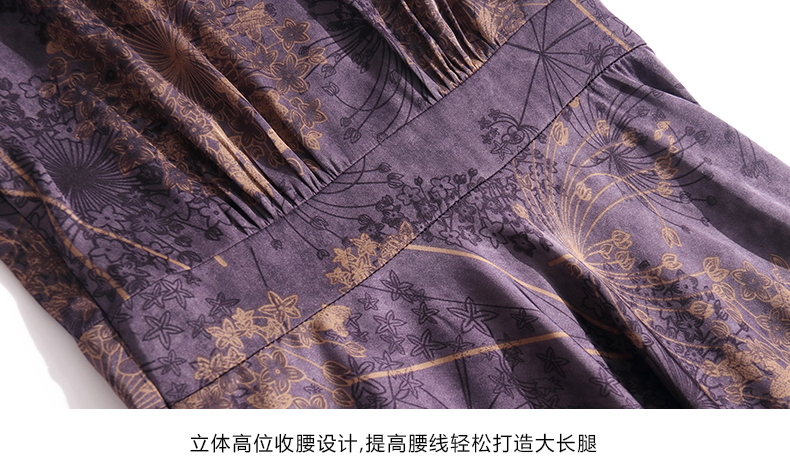 紫色V領印花連衣裙2023夏季新款高級感氣質修身大擺長裙時尚減齡