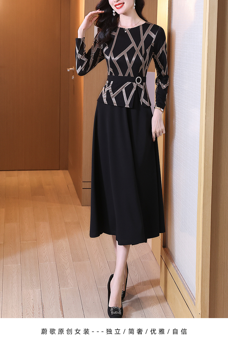 千鳥格假兩件女高腰拼接氣質連衣裙