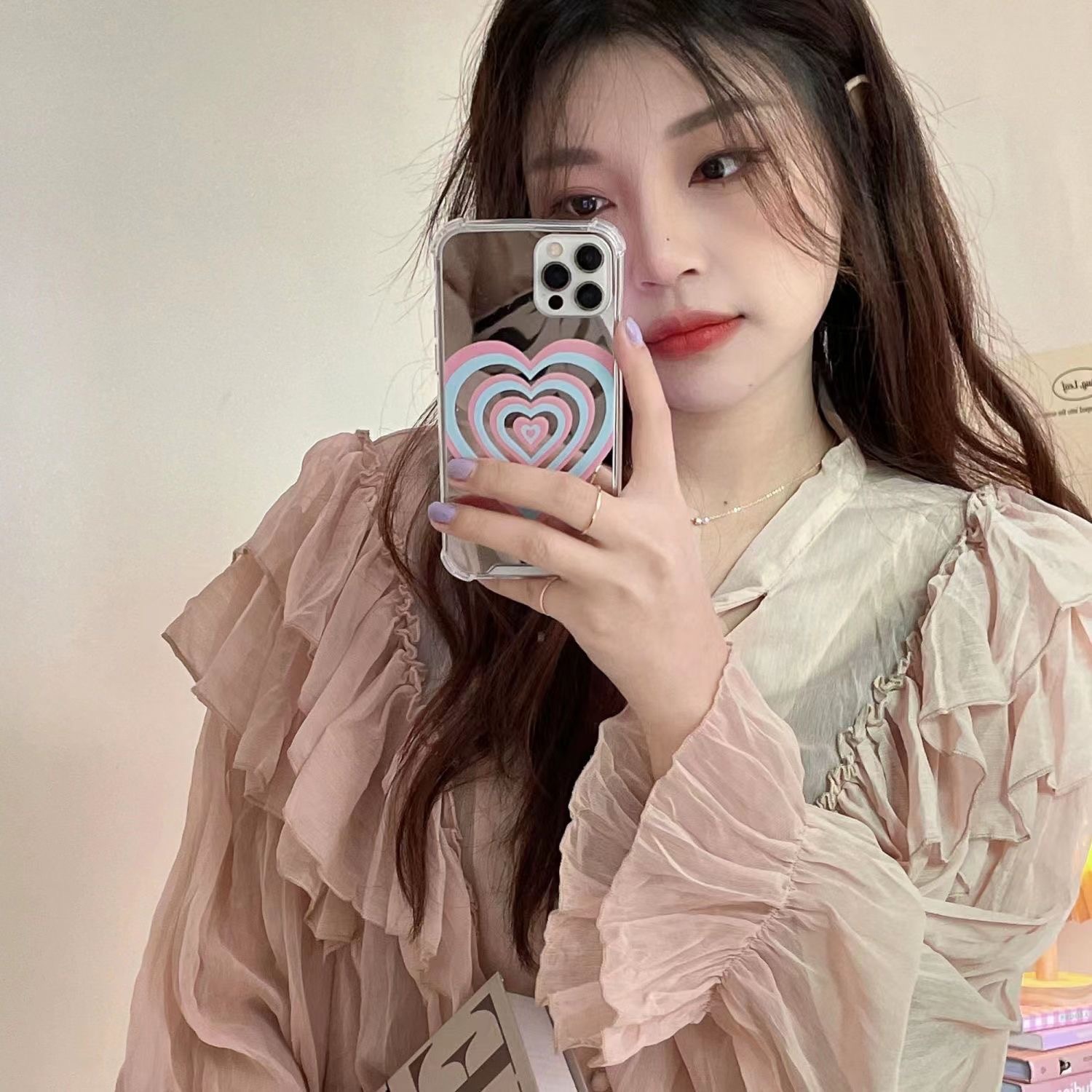 適用于蘋果簡約彩虹愛心潮流鏡面殼14手機殼鏡子11/12promaxins風高級xs/xr防摔7p創意13p少女心