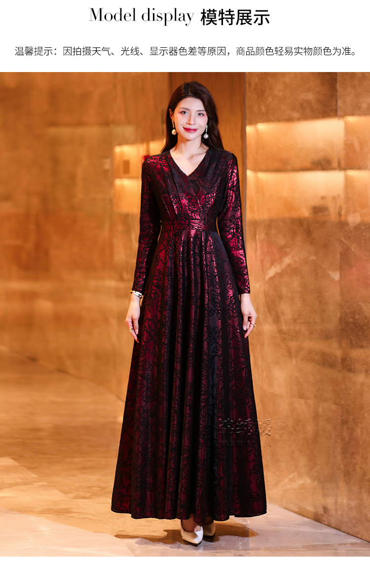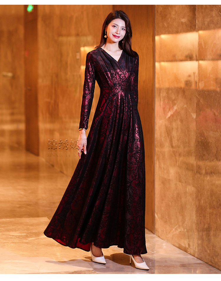 暗紅色提花連衣裙女2023春秋新款遮肚子減齡奢華大牌長袖大擺長裙