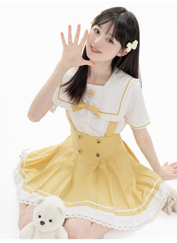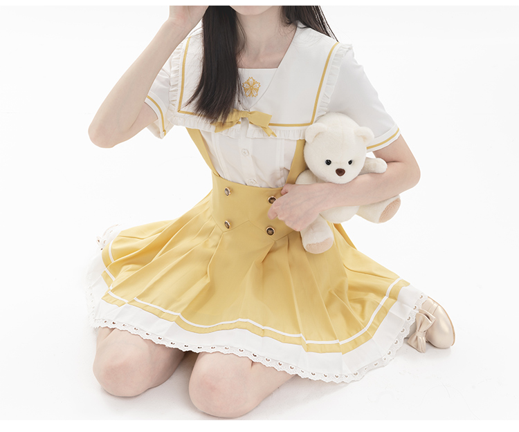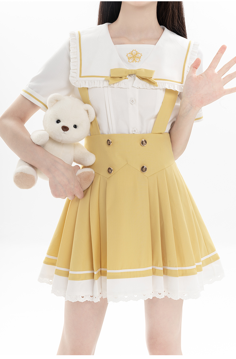 【啦啦醬】芒果果凍 學院風顯白連衣裙 收腰背帶裙水手領襯衫套裝