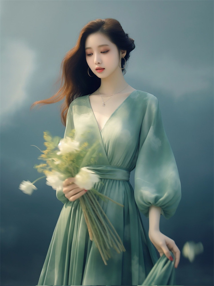 高端輕奢綠色服裝連衣裙2023網紅新款女夏泡泡袖收腰雪紡裙子仙女
