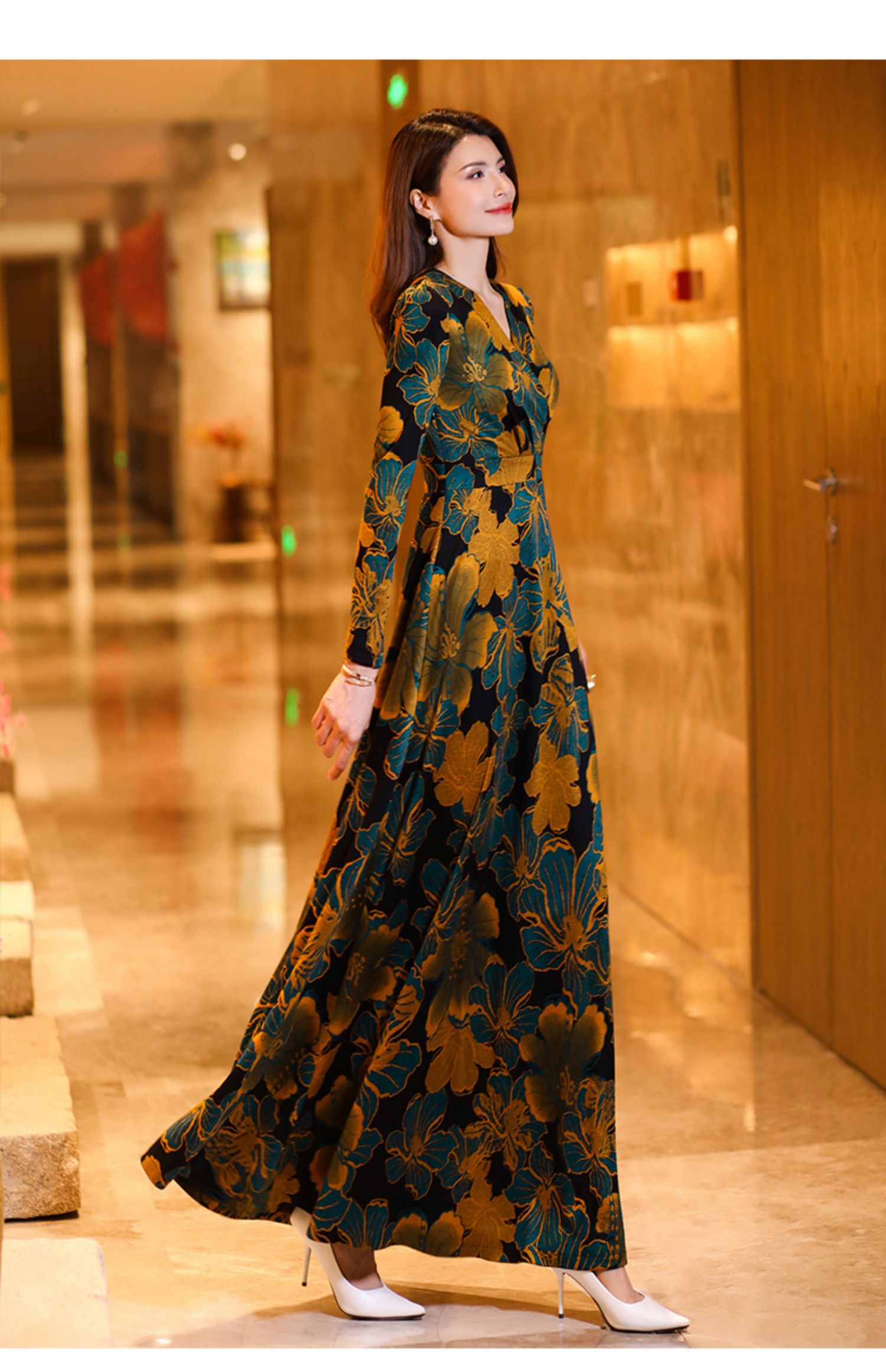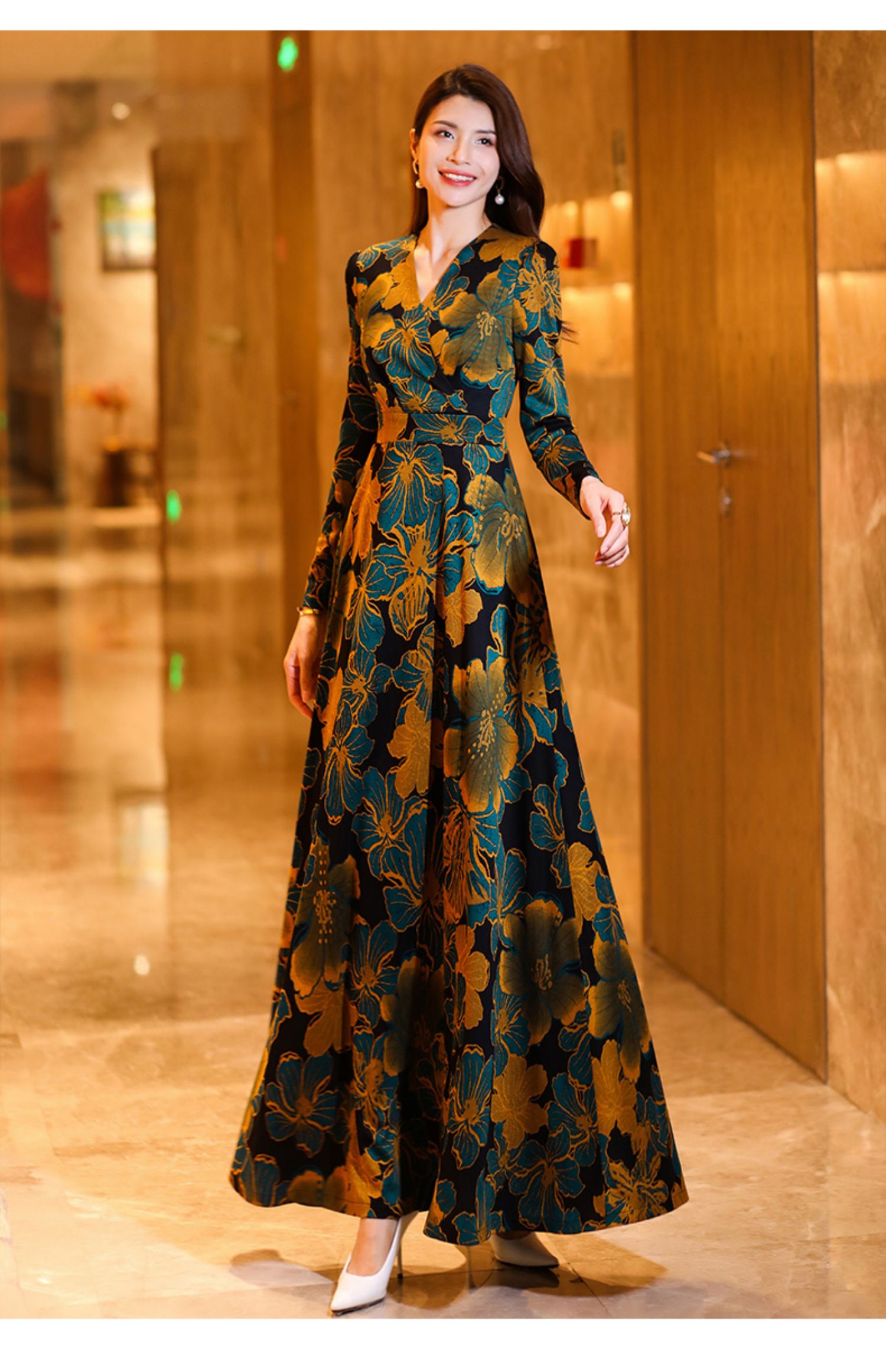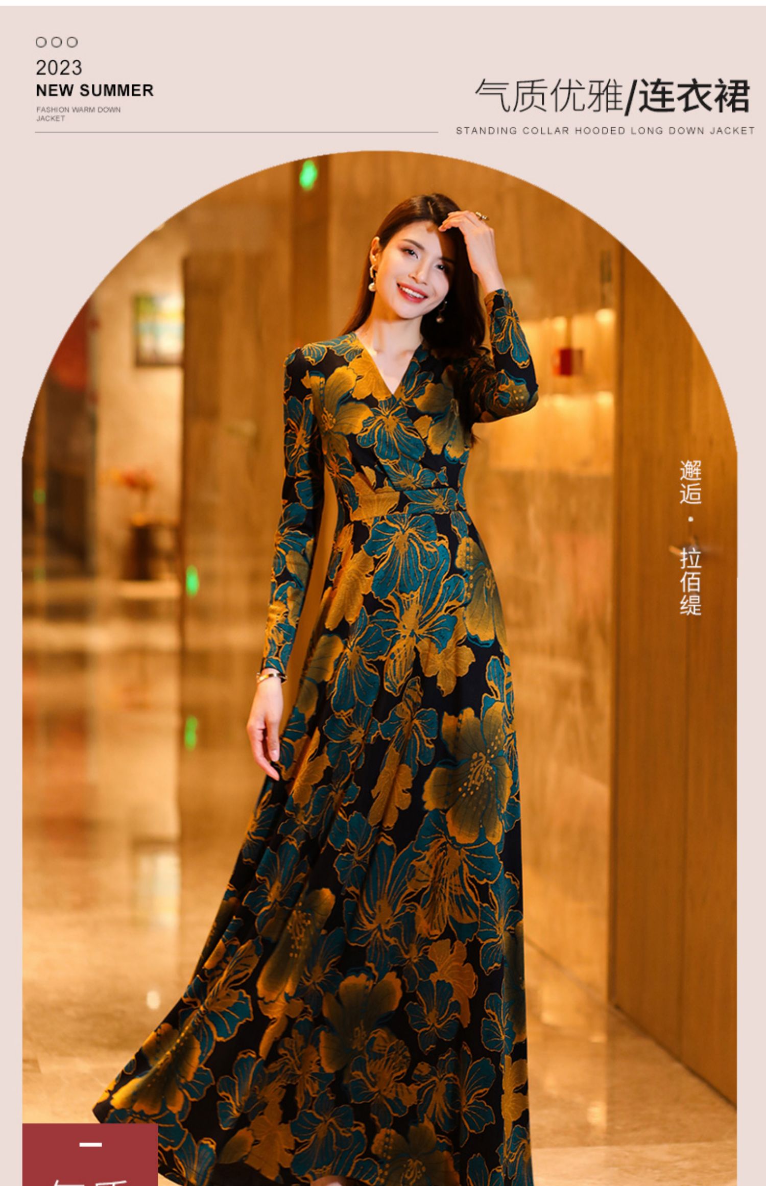復古氣質連衣裙女2023秋季新款時尚印花高端修身長款過膝裙子871