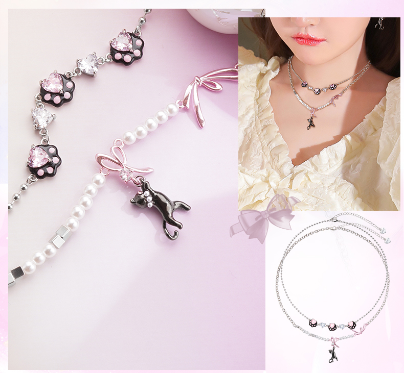 CIVET原創黑色貓咪項鏈少女甜酷辣妹頸鏈Y2K蝴蝶結珍珠毛衣鏈學生