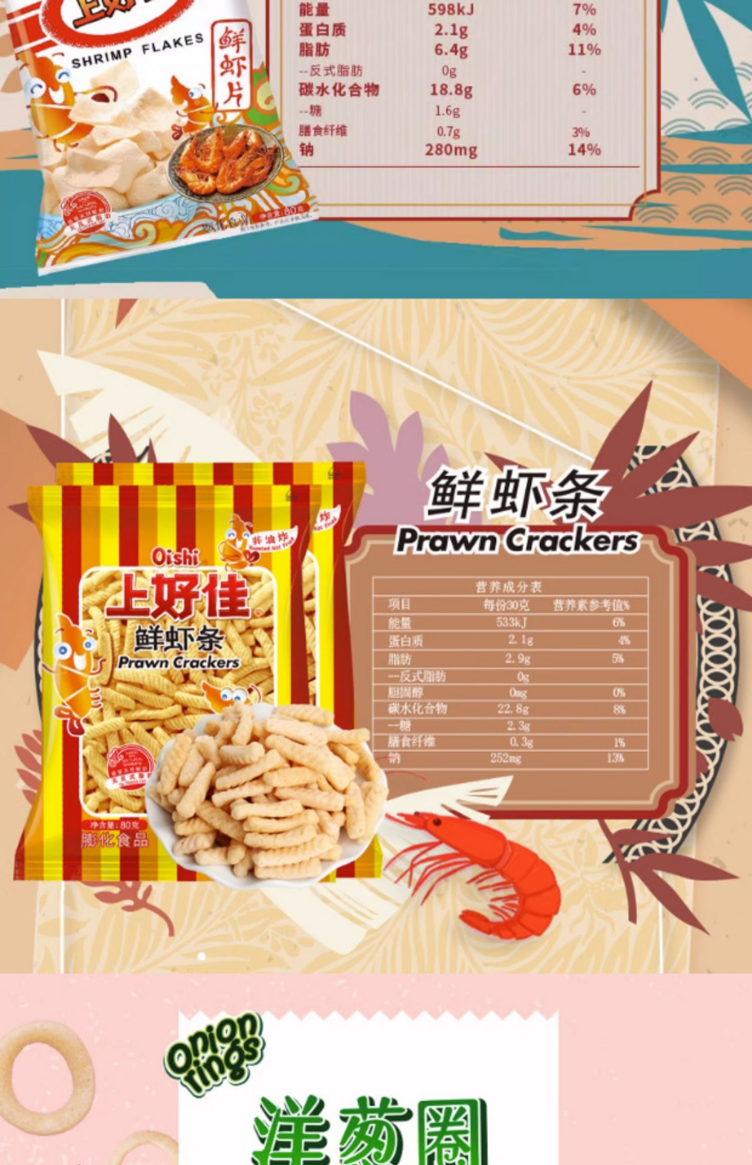 上好佳鮮蝦片零食炸原味蝦條洋蔥圈薯片兒童食品休閑小吃整箱批發