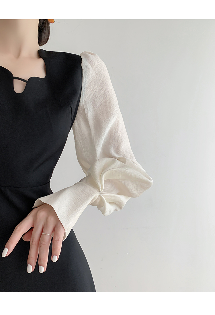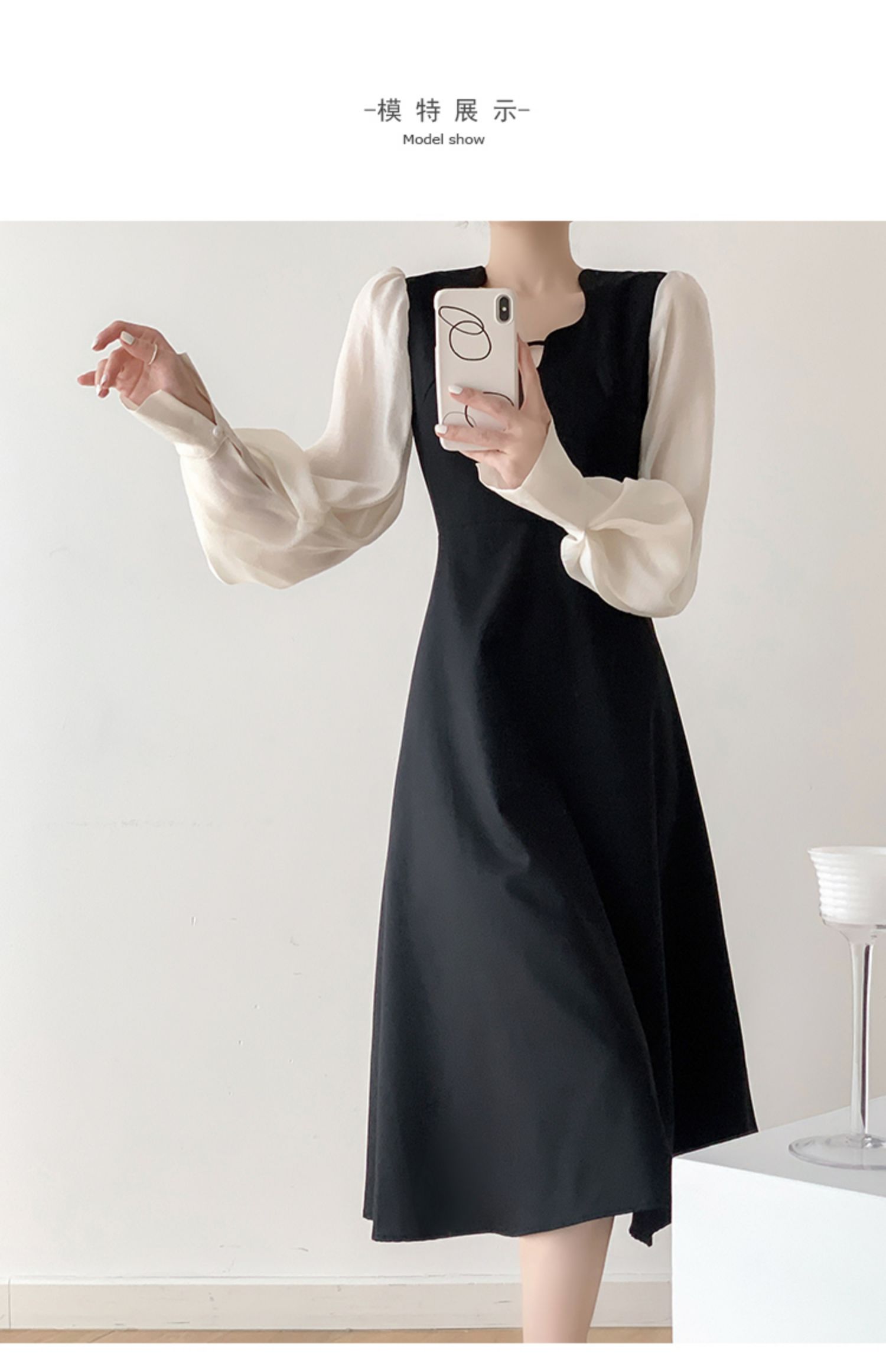 Fening Maje 秋季法式復古長袖絲絨連衣裙小眾打底黑白拼接仙女裙