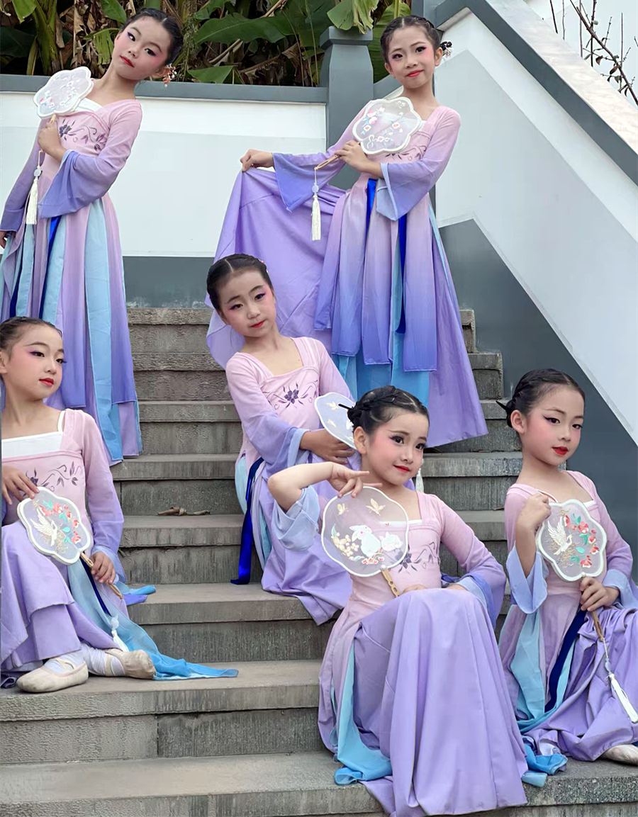 兒童古典舞演出服春三月飄逸紗衣女童舞蹈練功服中國舞漢服表演服