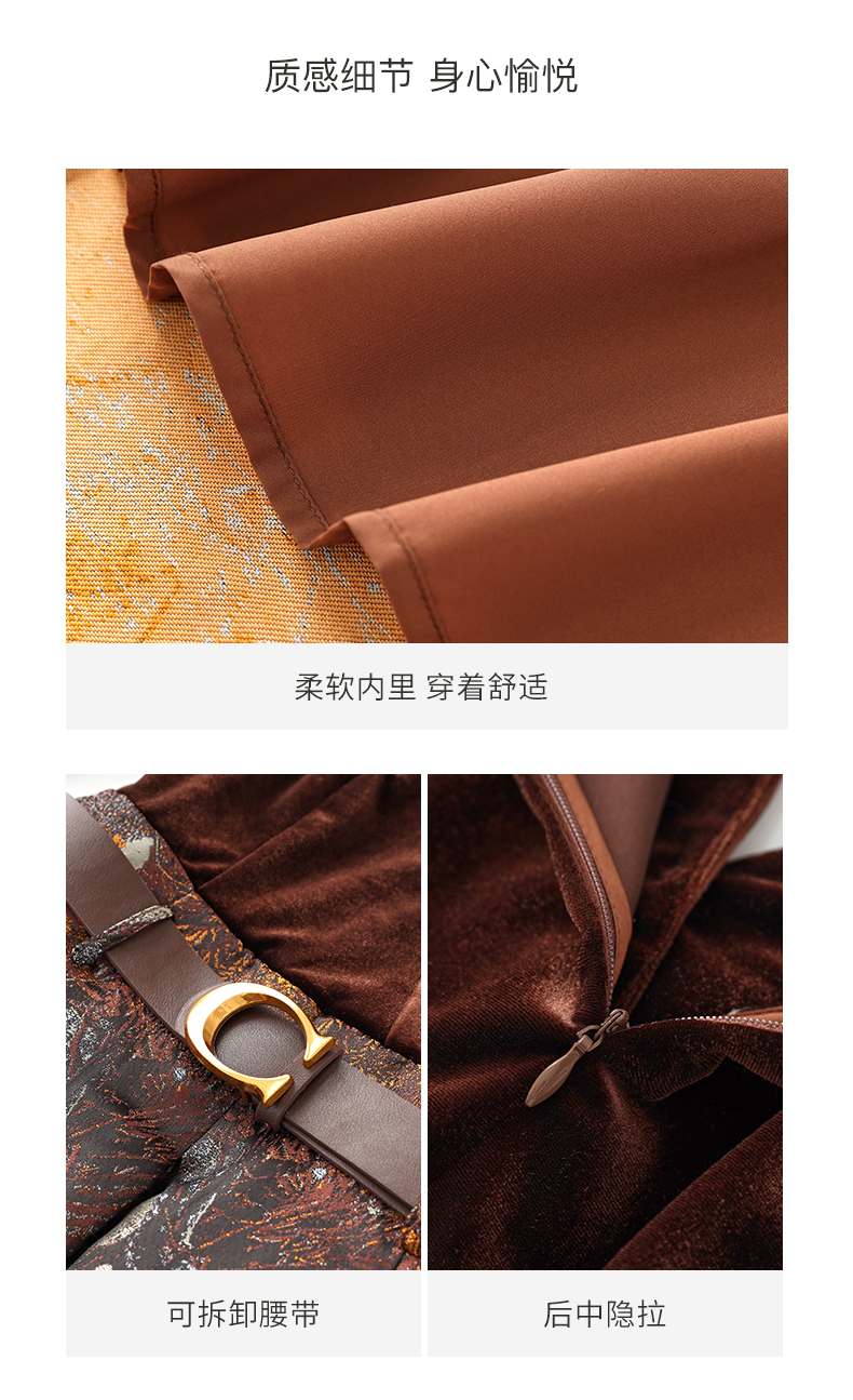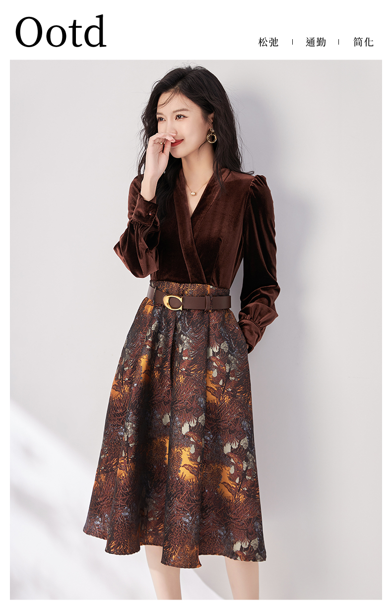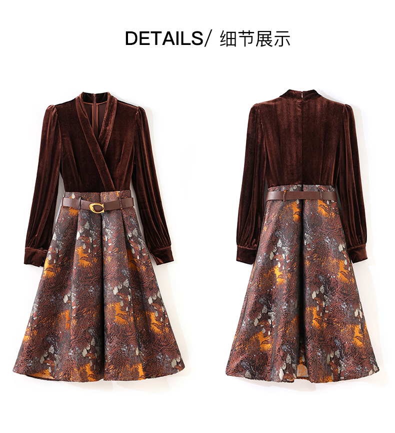 輕奢絲絨連衣裙女秋冬新款2023氣質V領收腰提花拼接裙子女內搭潮