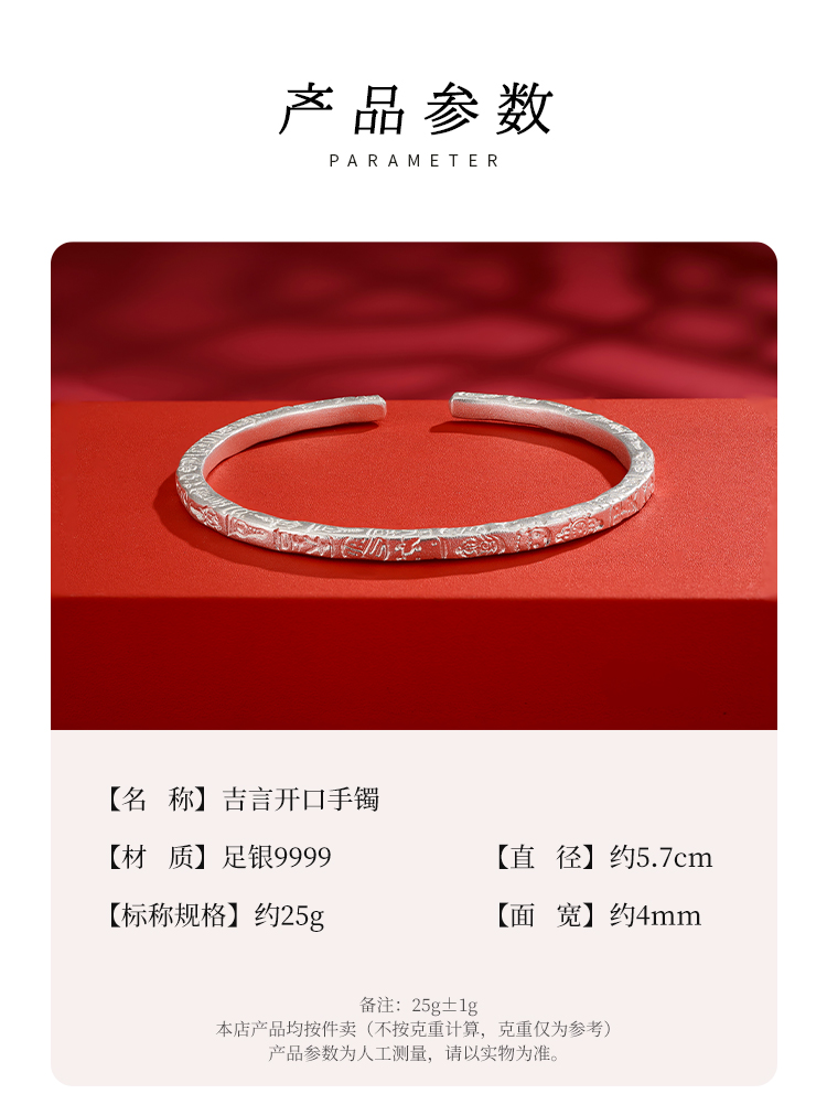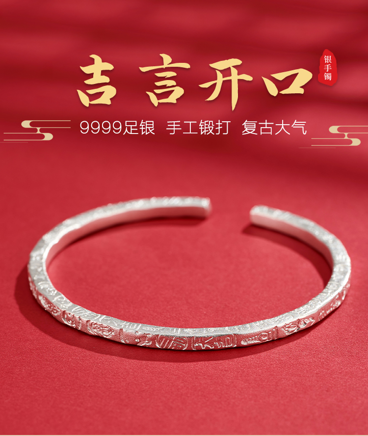 順欽銀樓S9999雪花銀手鐲足銀鐲子吉言國潮情侶款手環漢服配飾禮