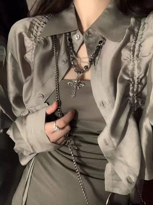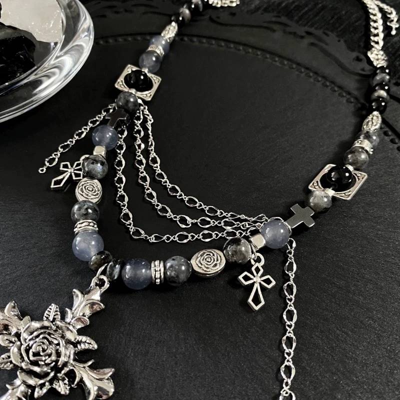 甜酷Y2K辣妹十字架串珠玫瑰花朵chocker項鏈哥特鎖骨鏈男女