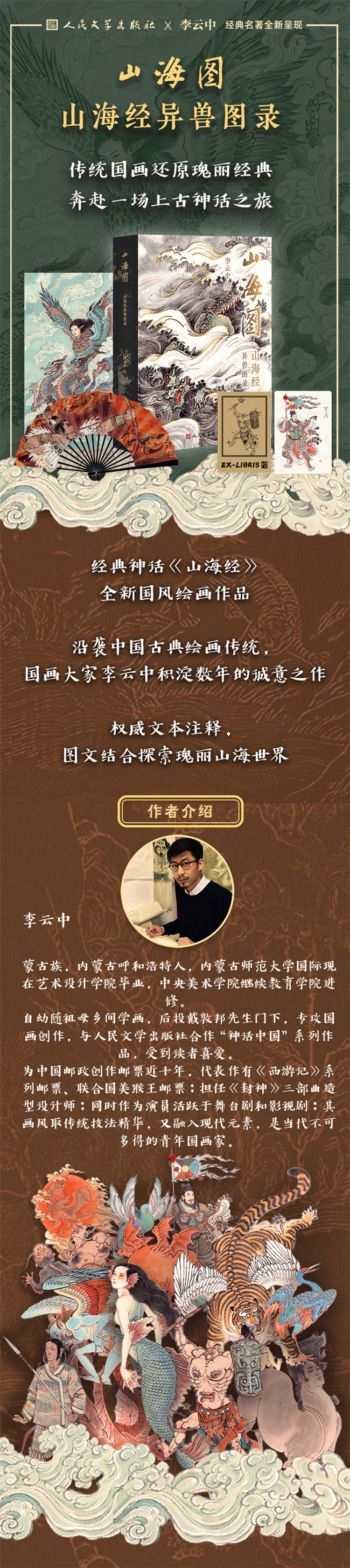 《山海經》被稱為“史地之權輿,神話之淵府”,是屬于中國人的不朽經典;《山海經》里的異獸也是許多文學作品、影視、游戲的靈感來源;青年畫家李云中積淀數載而成,畫工精巧,落筆考究;以傳統技法還原上古異獸,東方審美的集大成者;配文選摘中華書局權威文本及翻譯,圖文皆成經典;作者李云中為戴敦邦先生親傳弟子,電影《三打白骨精》美術顧問,中國郵政《西游記》、《玄奘》、《美猴王》主題郵票設計者,業界盛贊:“斂目垂心自成天地,銳氣縱橫描繪古今。”精美裝幀,120g超感紙還原色彩,收藏贈禮的不二之選。封面、版權頁、條形碼:內容介紹:《山海經》是一部內容豐富、風貌奇特的古代佳作,堪稱中國奇幻、魔幻文學的開山鼻祖,涉及歷史、地理、民族、宗教、神話、生物、水利、礦產等方面內容,是中國文化的珍品,也是中國古人想象力的集中體現。本書集畫家李云中多年來的山海經國畫彩圖一百八十余張,配文并且采用中華書局權威版本《山海經》原文與翻譯,圖文水準皆有極高水準,希望以最中國化的形式展現出《山海經》的神怪世界。