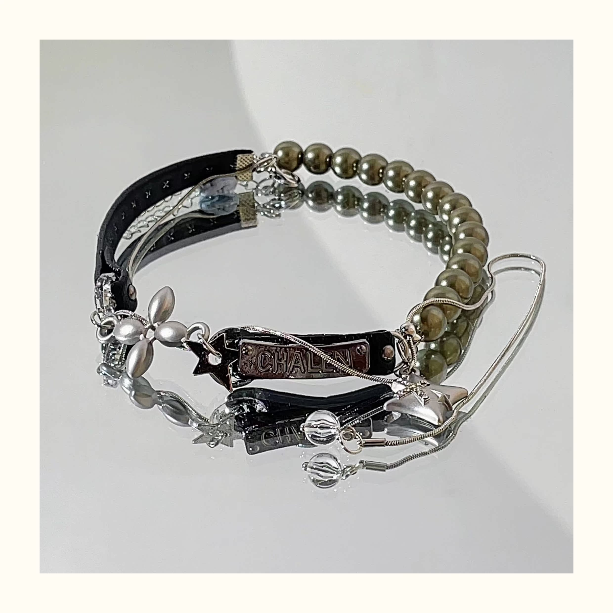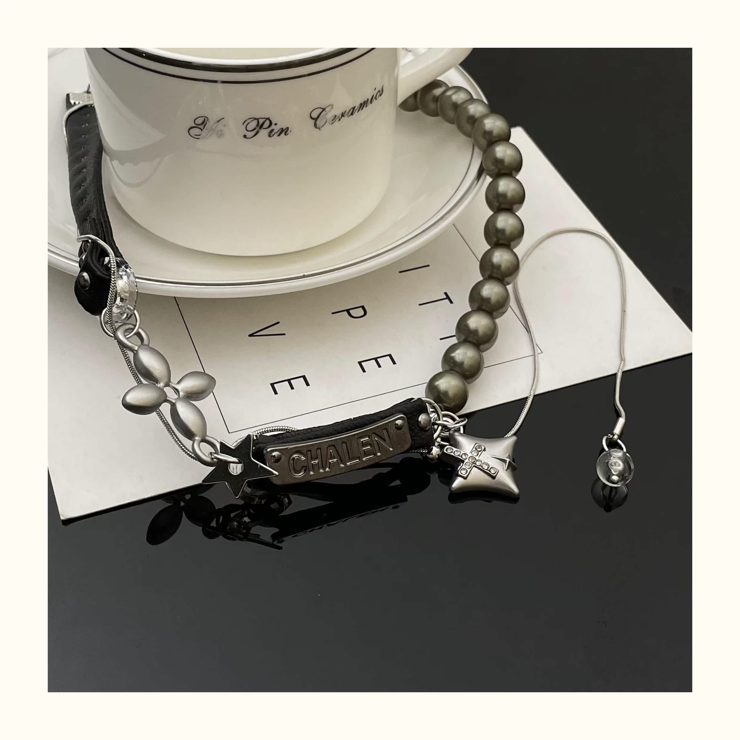 皮革綠色珠子拼接項鏈小眾設計感甜酷個性鎖骨鏈2023年新款潮百搭
