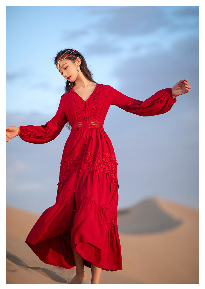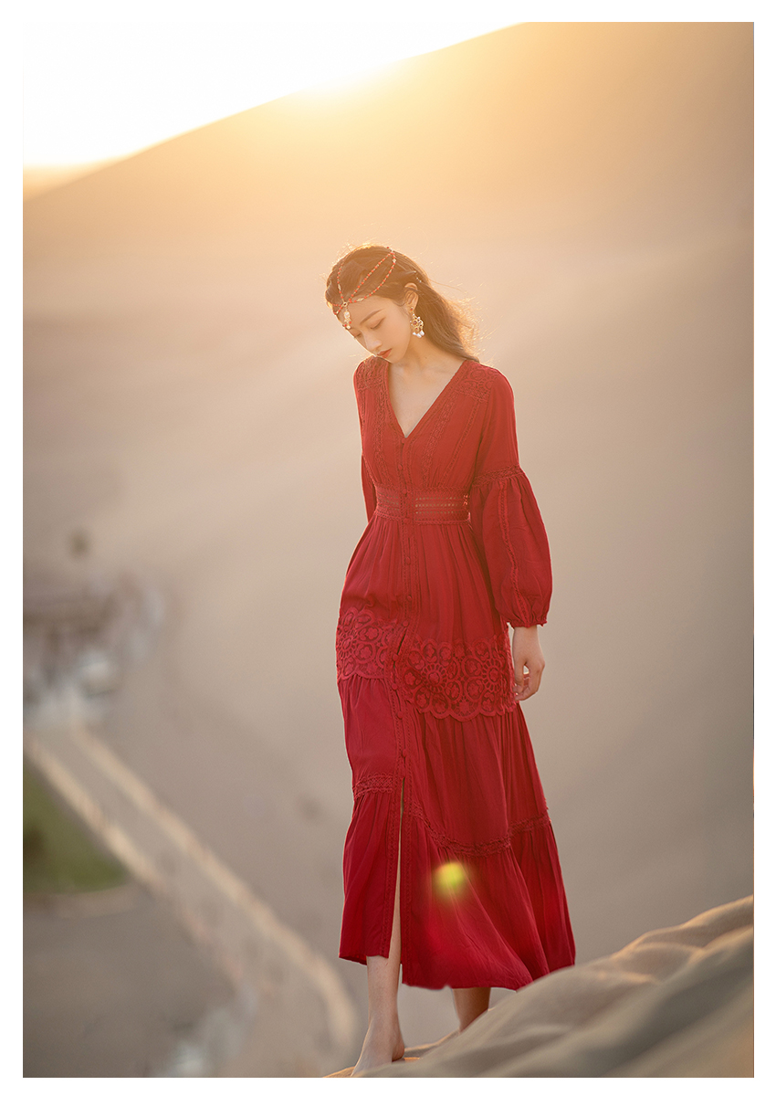仙女沙漠長裙海邊拍照衣服西北新疆旅游穿搭v領長袖紅色連衣裙秋