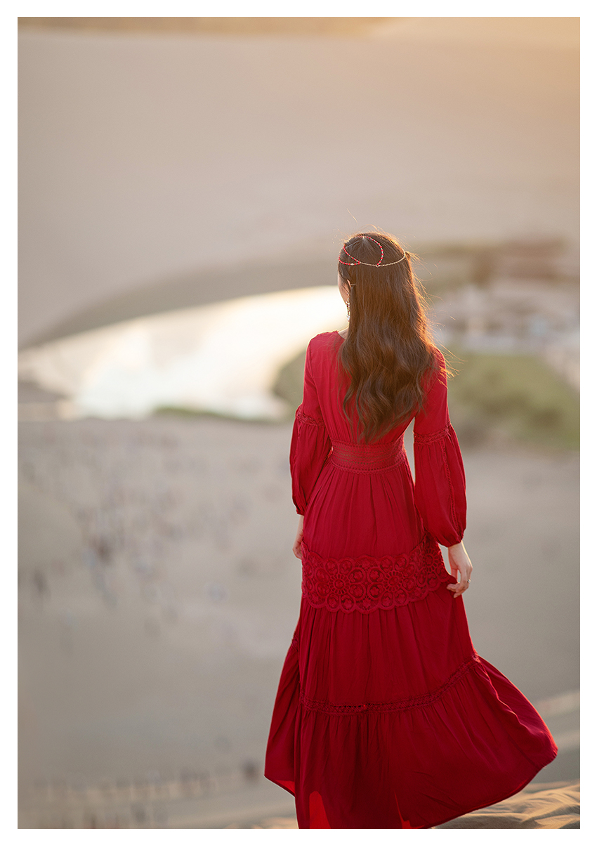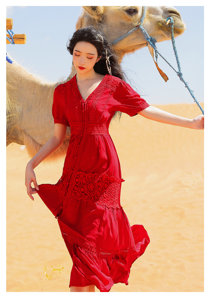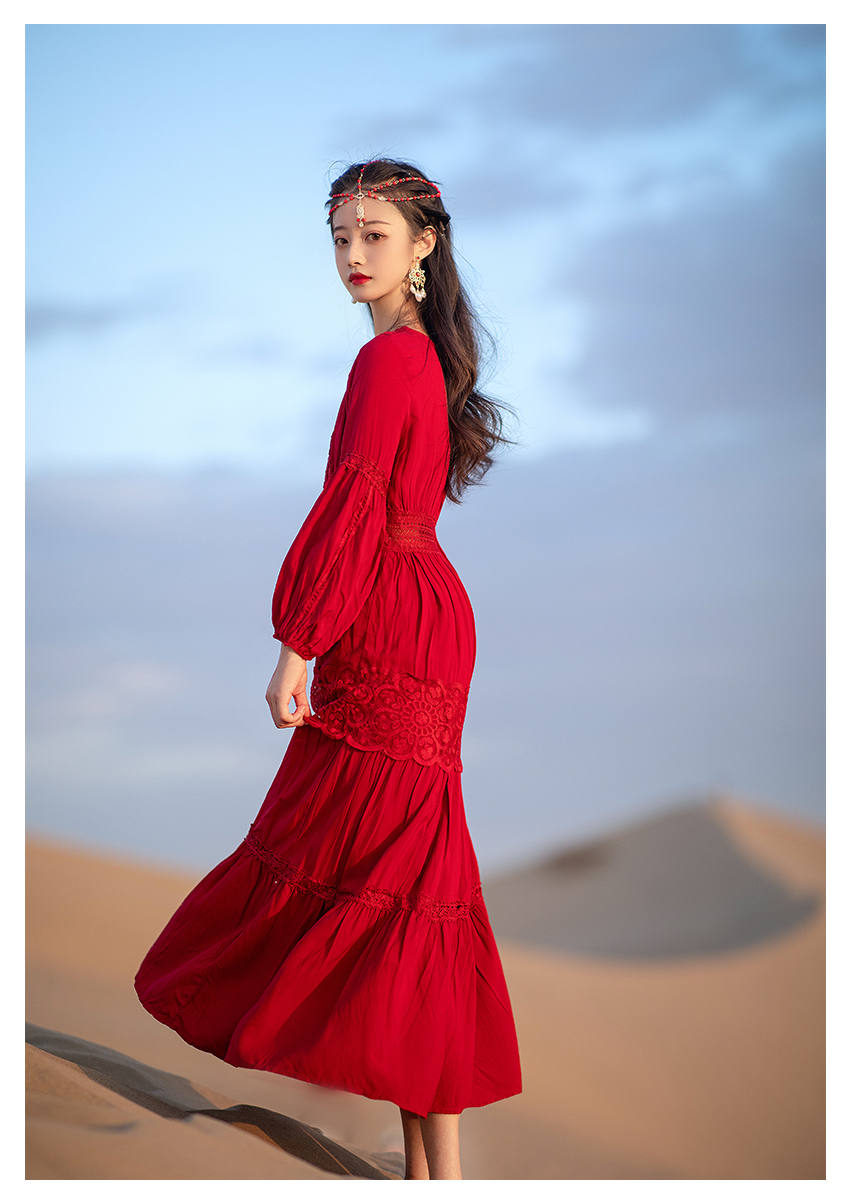 超好看的沙漠拍照度假長裙收腰顯瘦異域風西藏旅游穿搭紅色連衣裙
