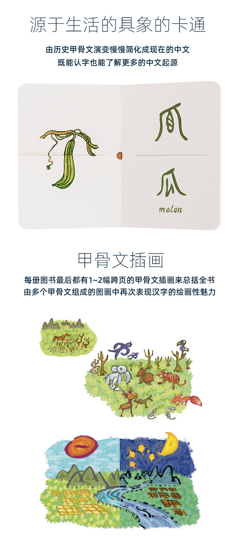 它用形象的甲骨文、充滿童趣的圖畫和精心的設計,送給孩子幼年一份獨特的禮物。讓孩子在初認識漢字的時候就感受到漢字的趣味和美。
