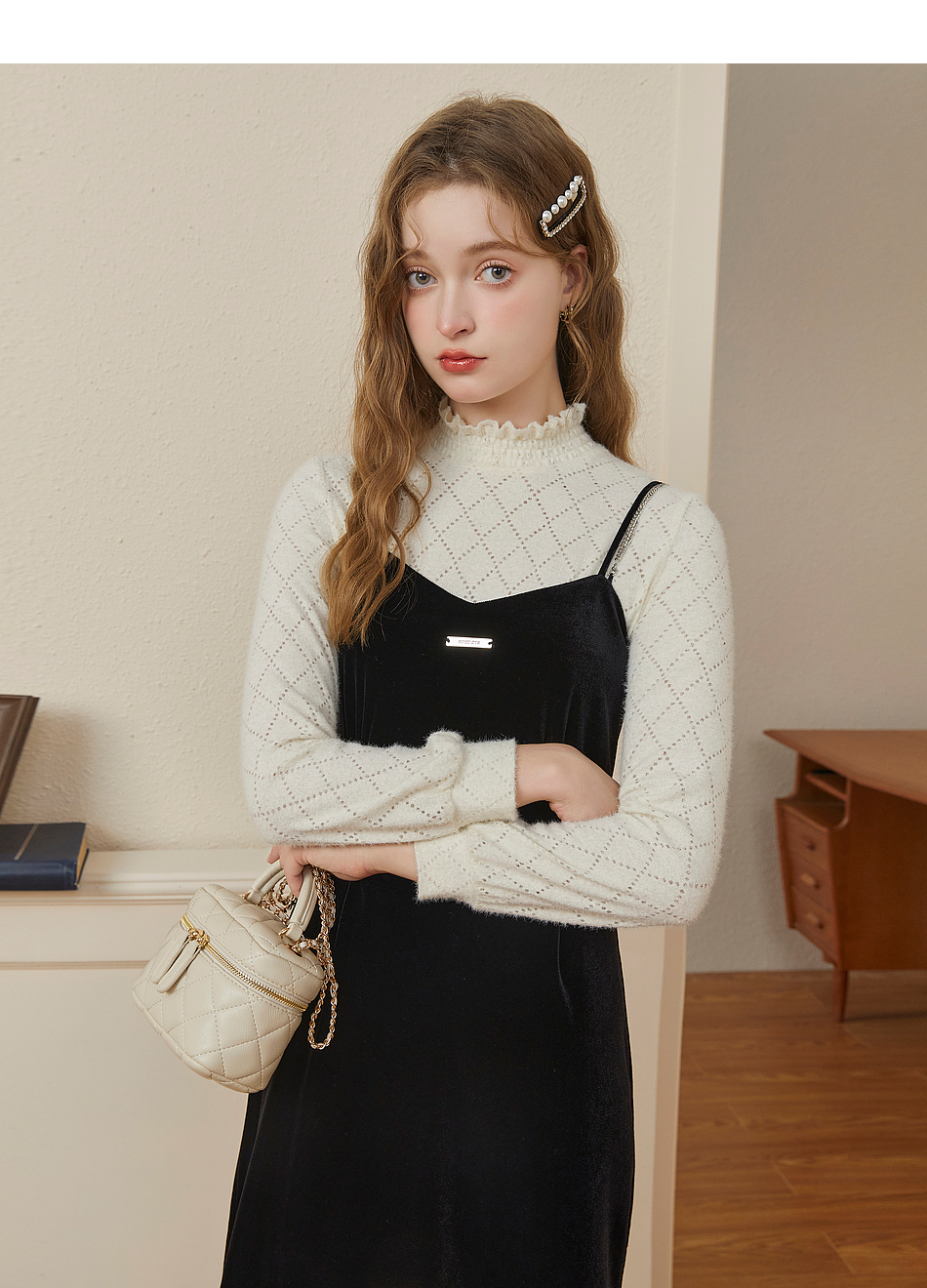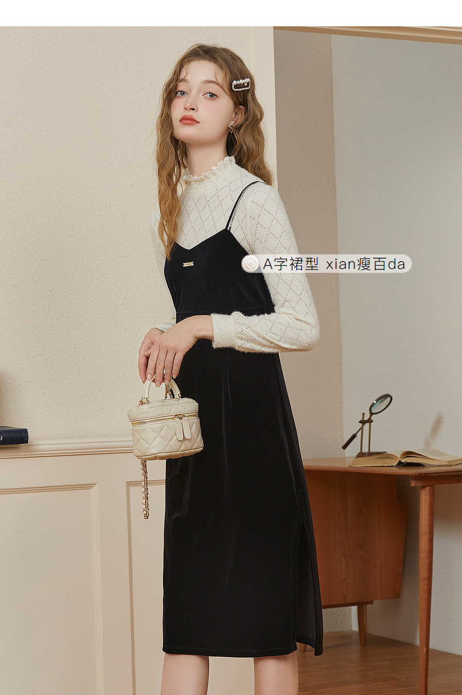 連衣裙女復古風絲絨吊帶裙 kbne2023秋裝新款收腰氣質女神范裙子