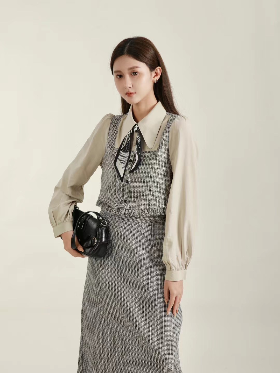 時尚高級學院風小香套裝長裙帶絲巾短款上衣半身裙時尚氣質兩件套