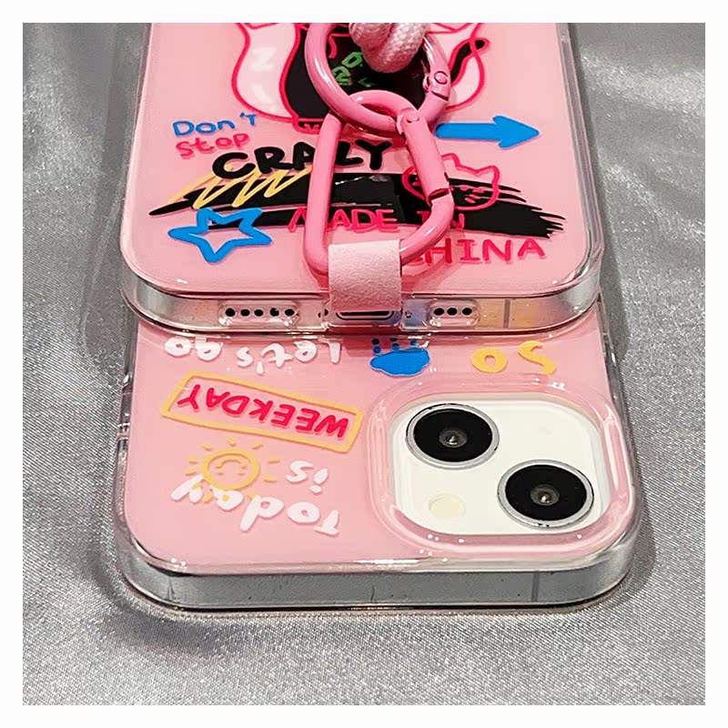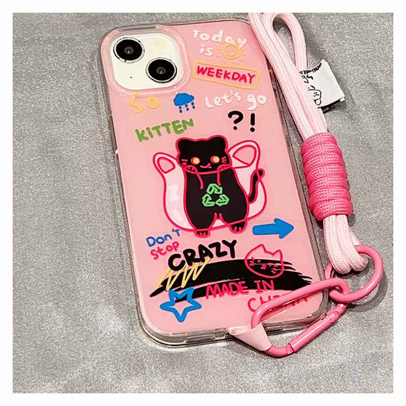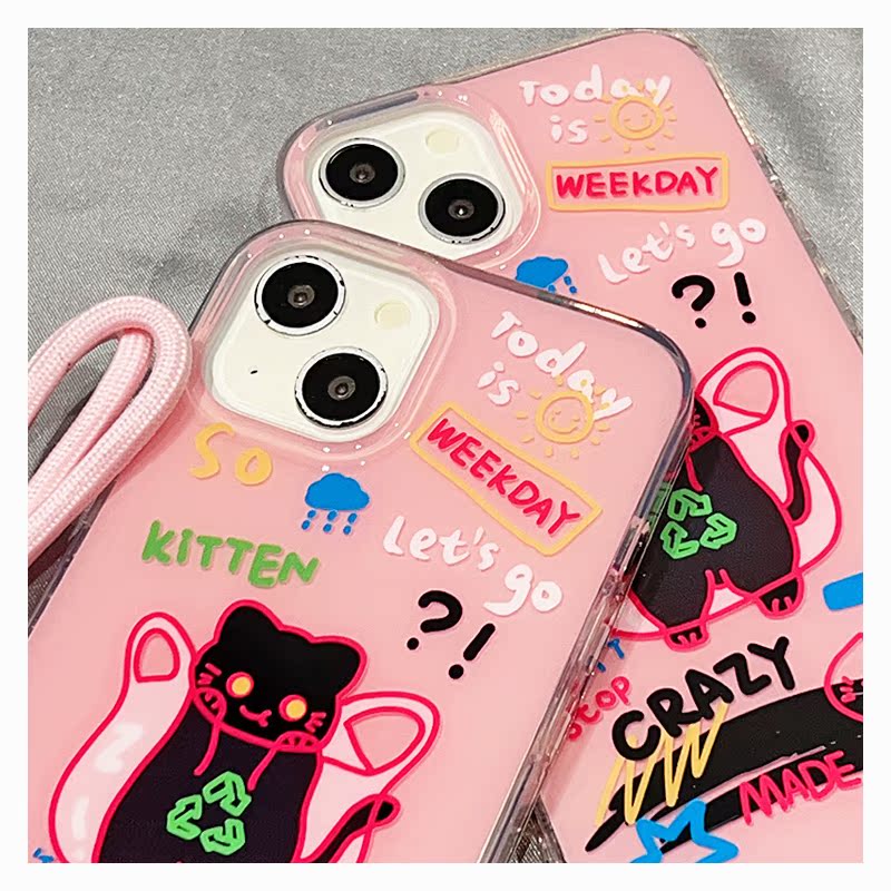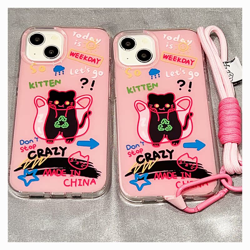 粉色袋子小黑貓手鏈適用蘋果14promax手機殼iphone13女款14pro新款12少女可愛創意卡通11雙層13pro防摔15pro