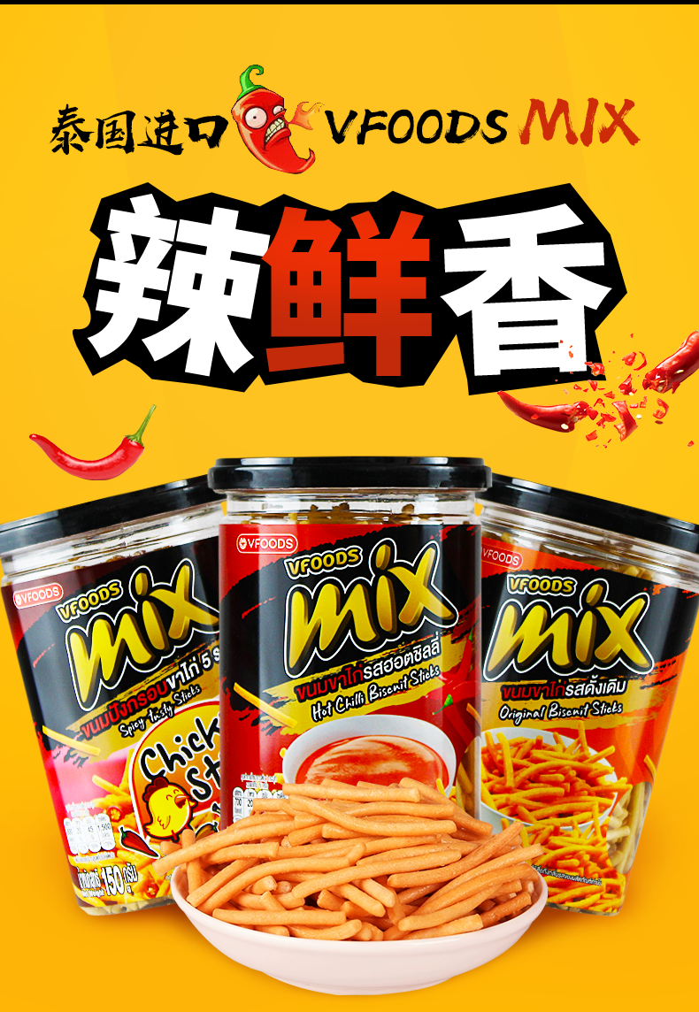 泰國進口VFOODS MIX脆脆條香辣蝦條8090懷舊休閑小吃食品膨化零食