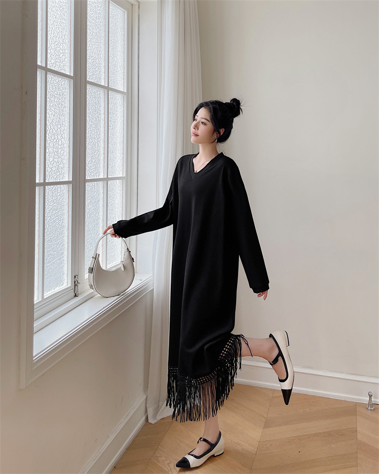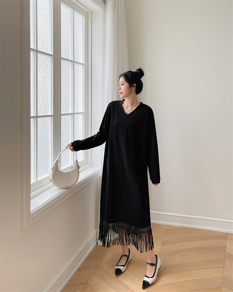 胖mm長袖連衣裙2023秋裝韓版新款遮肉顯瘦內搭打底裙子V領小黑裙