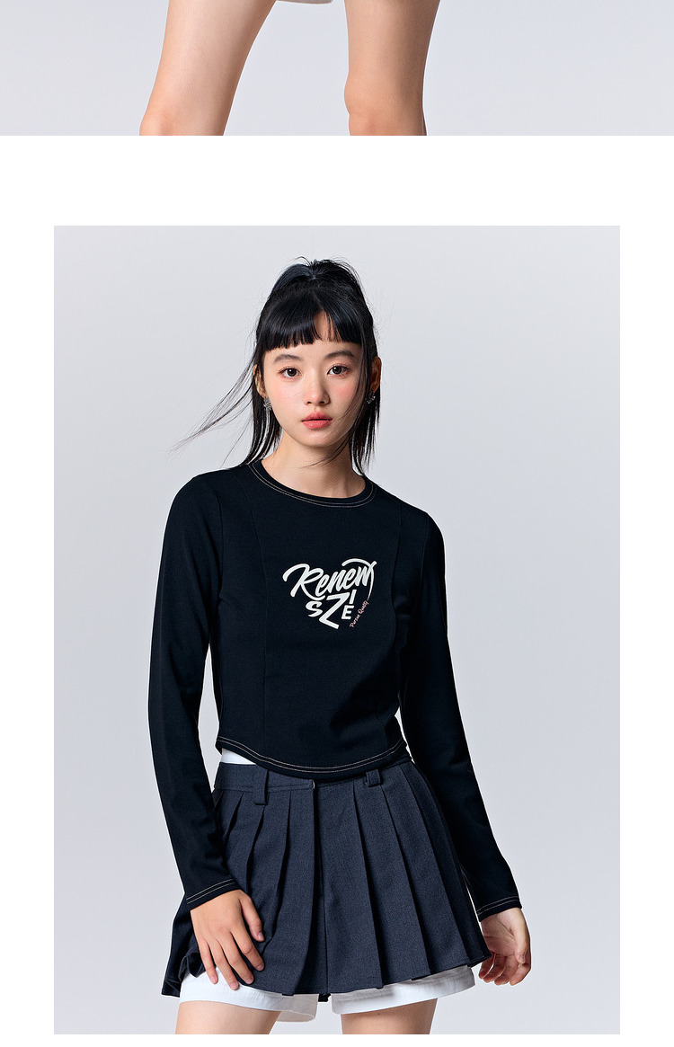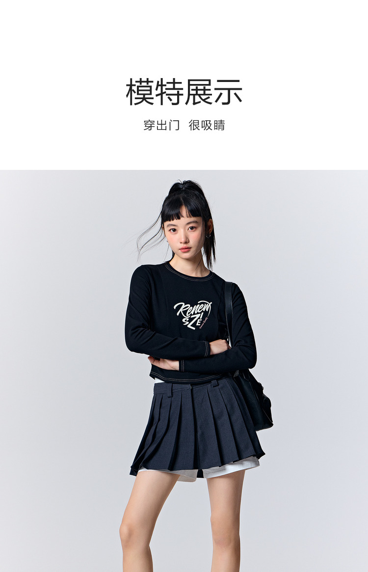 森馬長袖T恤女短款辣妹緊身上衣2023秋冬新款字母印花長袖衣服甜