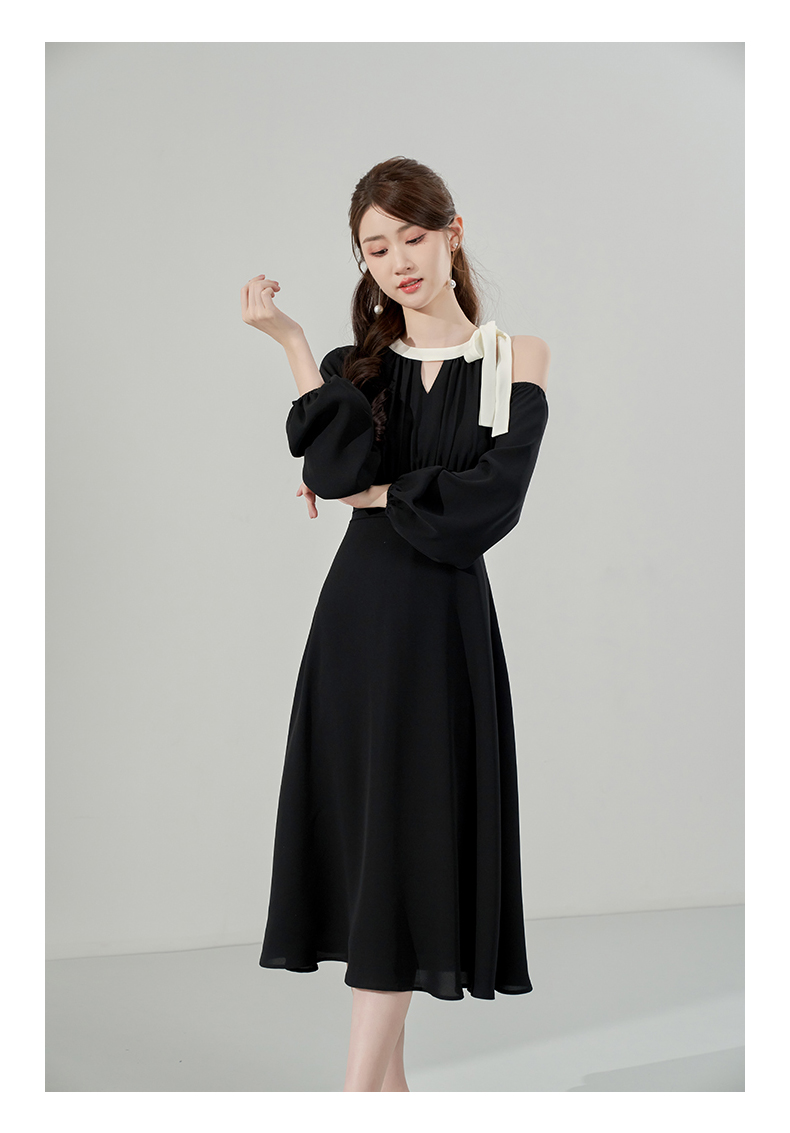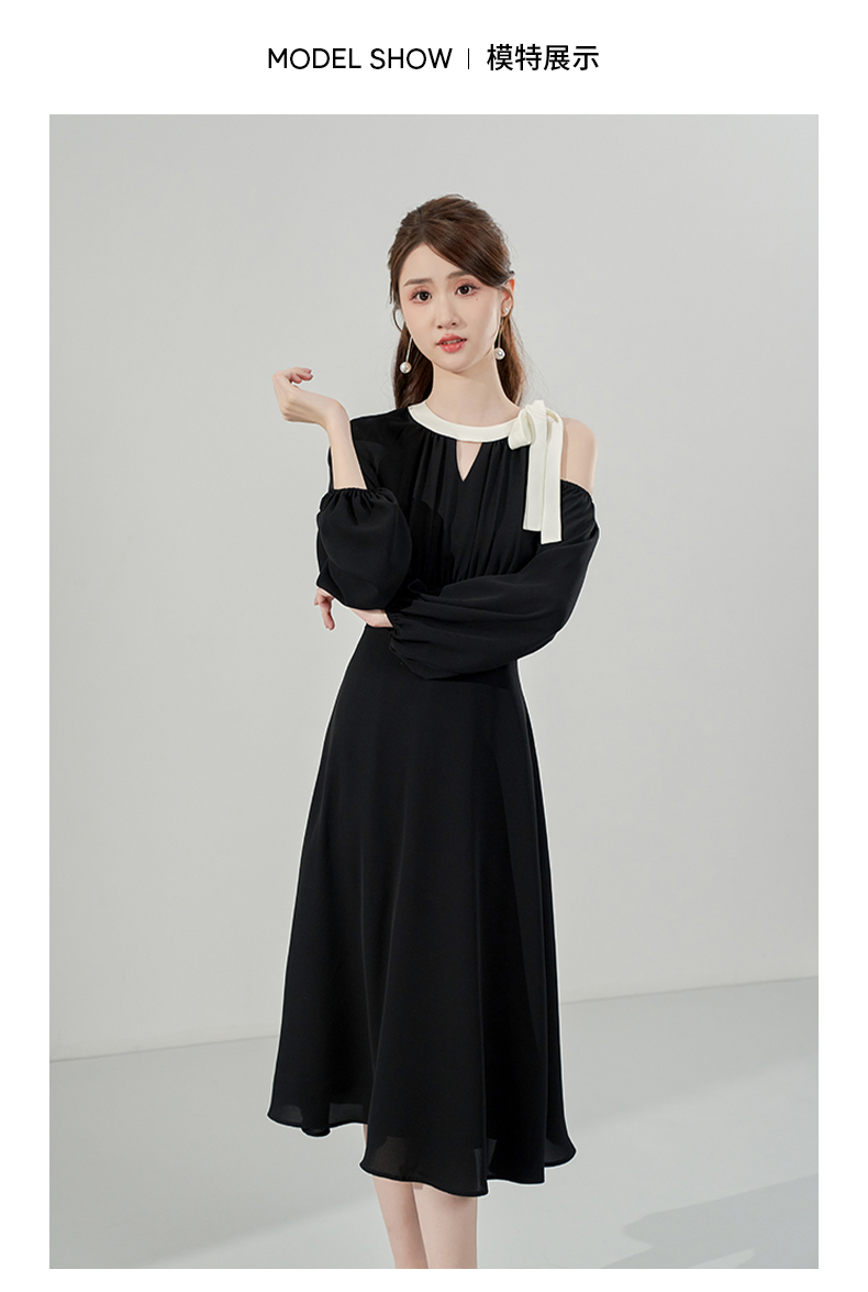 韓語琳法式連衣裙女春秋2023新款氣質收腰顯瘦高級感長袖露肩裙子
