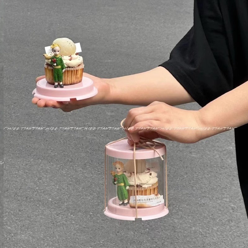 七夕情人節小王子拿花蛋糕裝飾擺件2寸圓形透明包裝盒迷你蛋糕盒