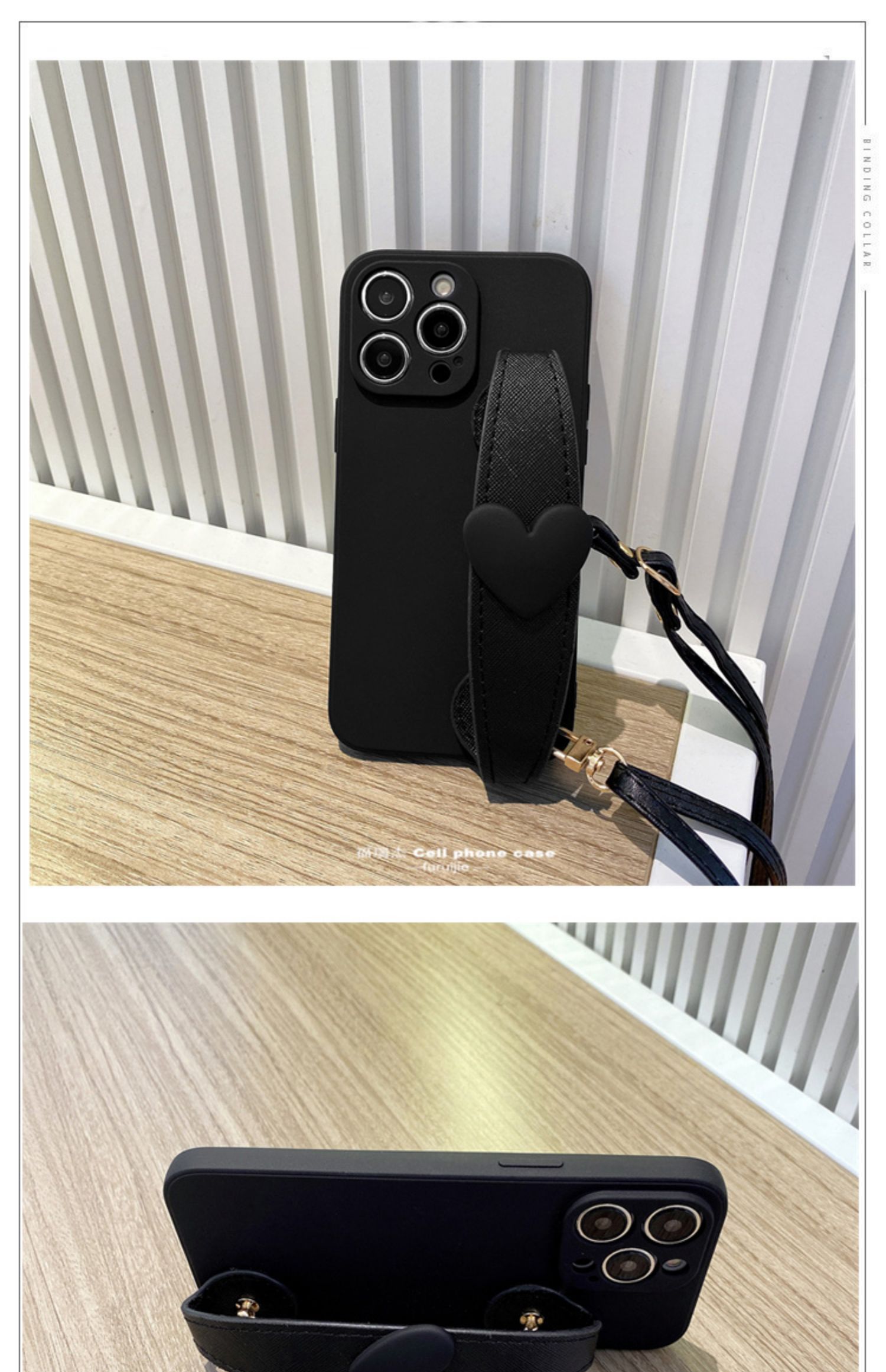 黑色愛心腕帶適用蘋果14手機殼iphone13/14promax斜挎15掛繩12支架11背帶13pro掛鏈xsmax/xr女7p/8plus防摔套