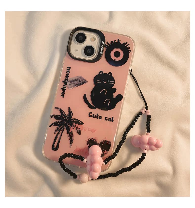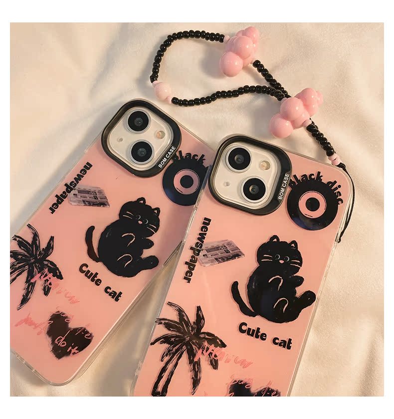 獨殼 卡通涂鴉黑色貓咪適用蘋果14ProMax手機殼粉色iphone13新款12小眾14pro女款11防摔15硅膠全包保護套軟殼