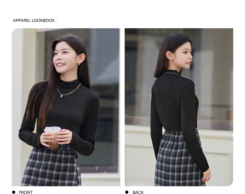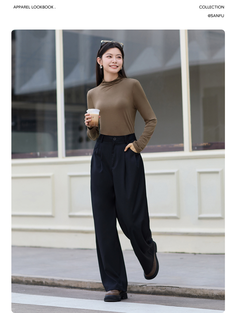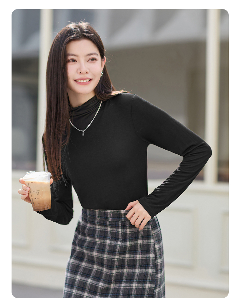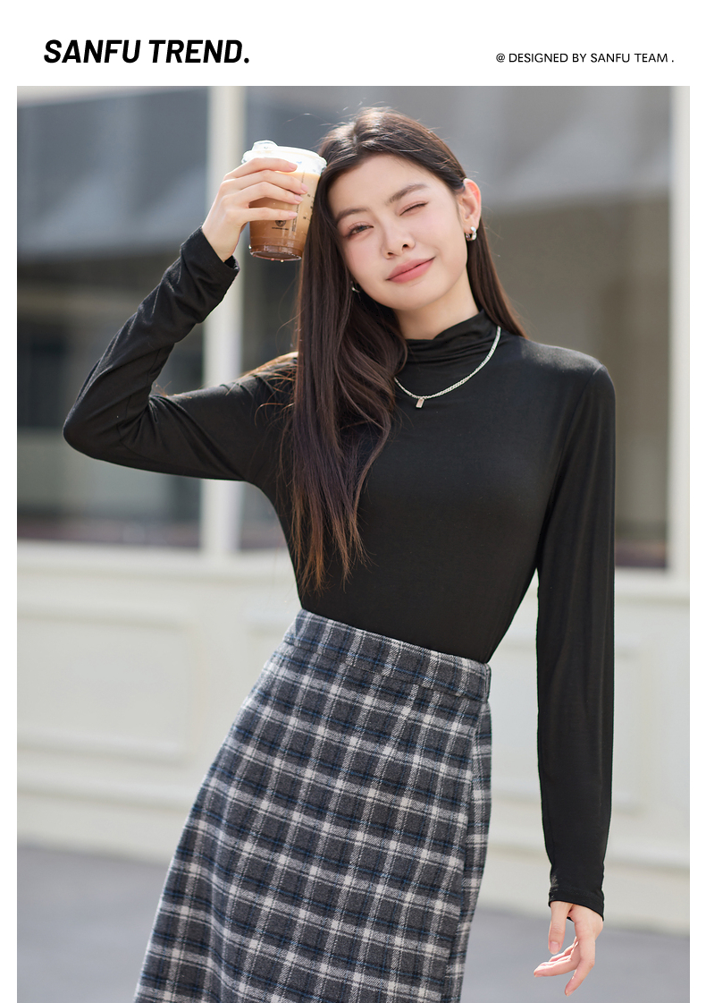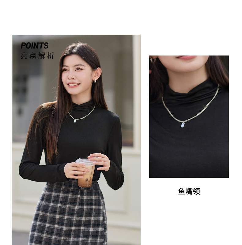 三福長袖高領T恤2023秋冬魚嘴領純色修身內搭打底衫上衣女474319