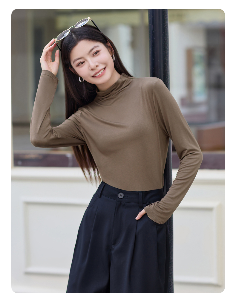 三福長袖T恤2023秋氣質木耳邊半高領簡約修身打底上衣女472712