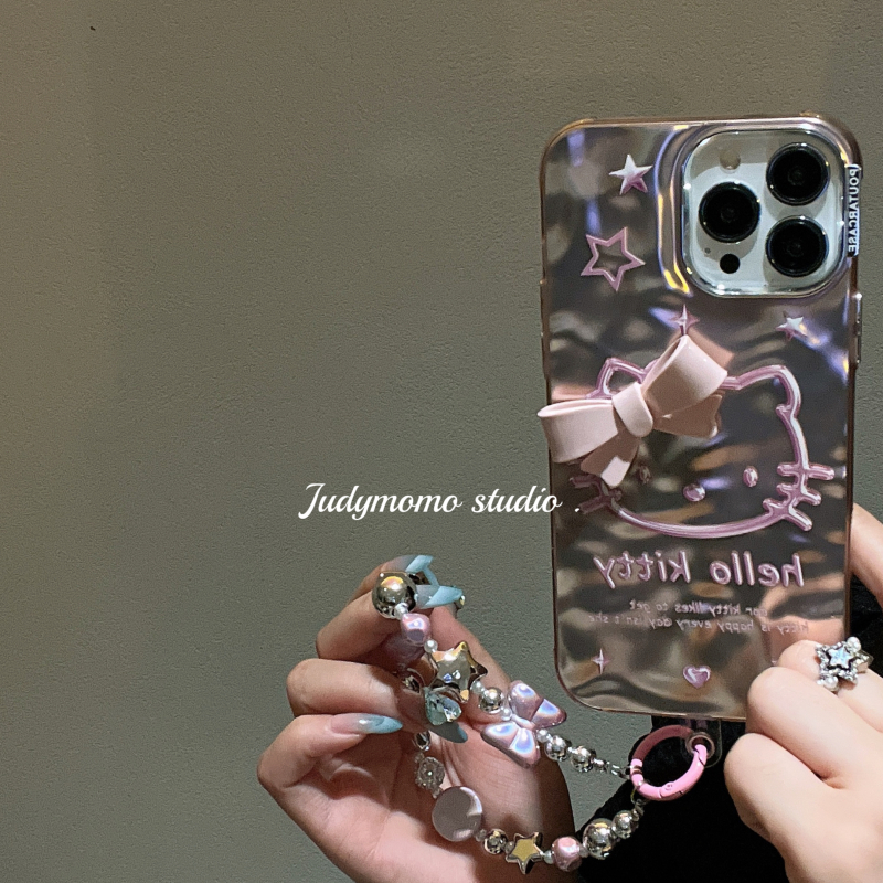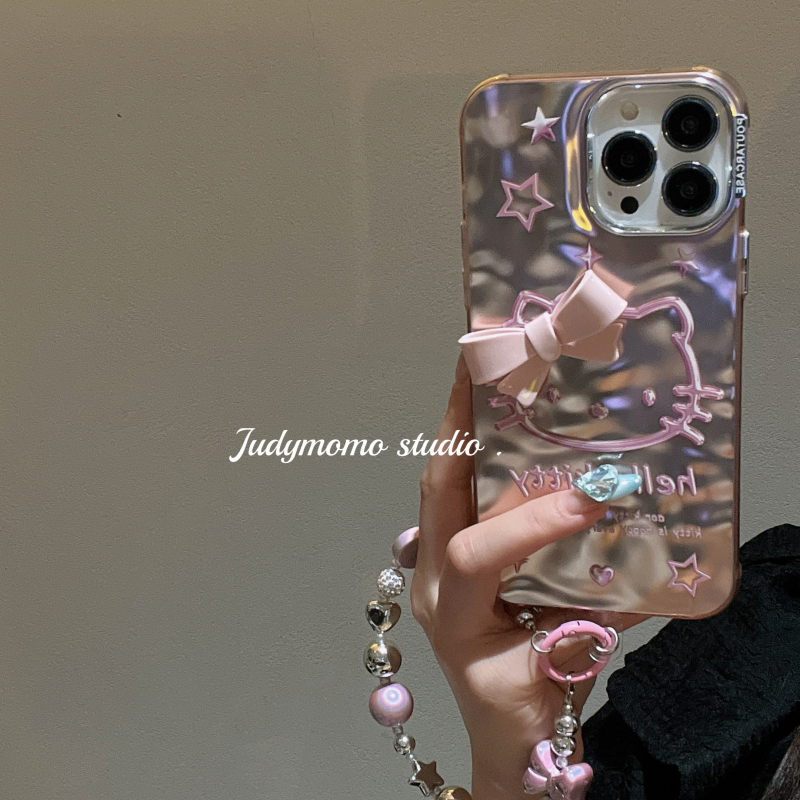 ins愛麗絲花園粉貓咪蝴蝶結手機殼適用iPhone13拍個14promax蘋果12手機鏈11新款支架