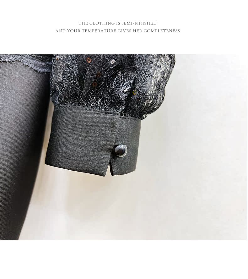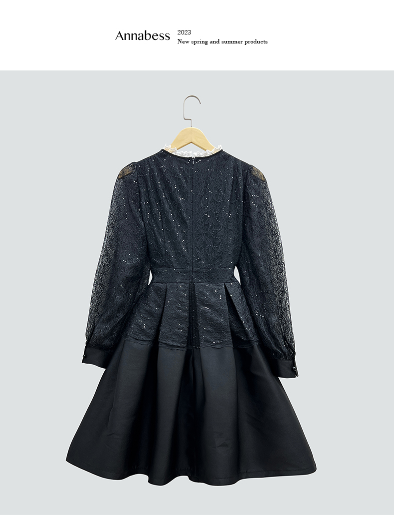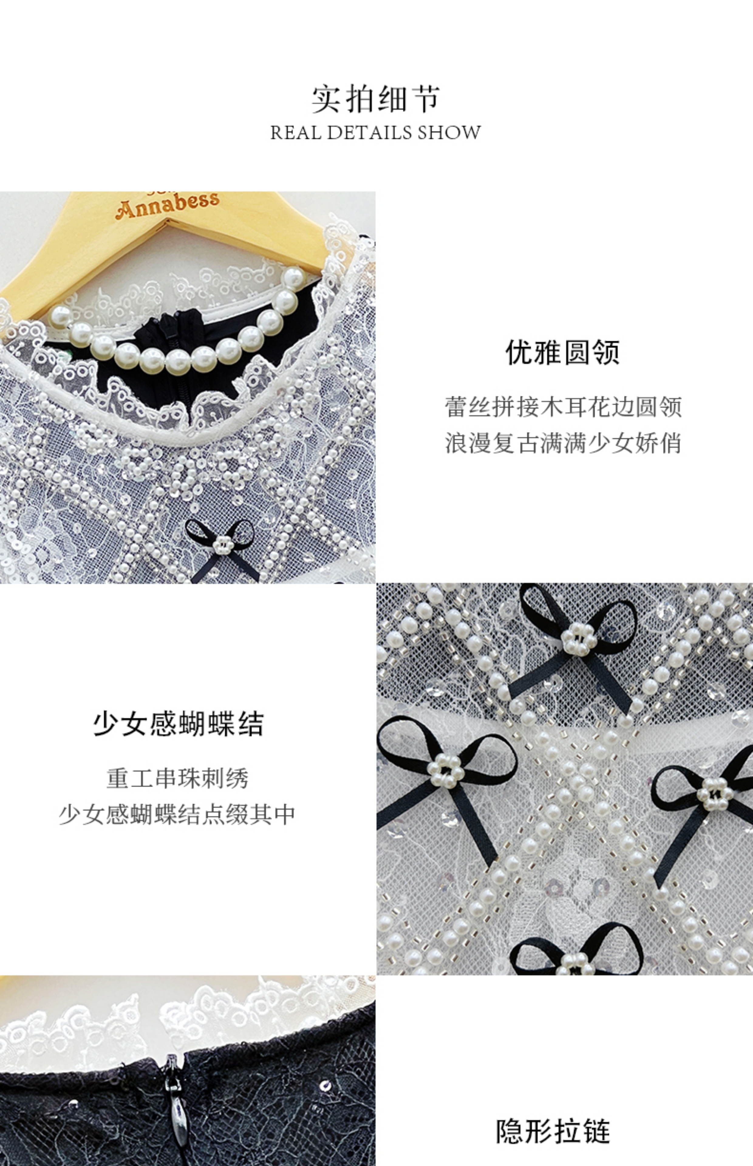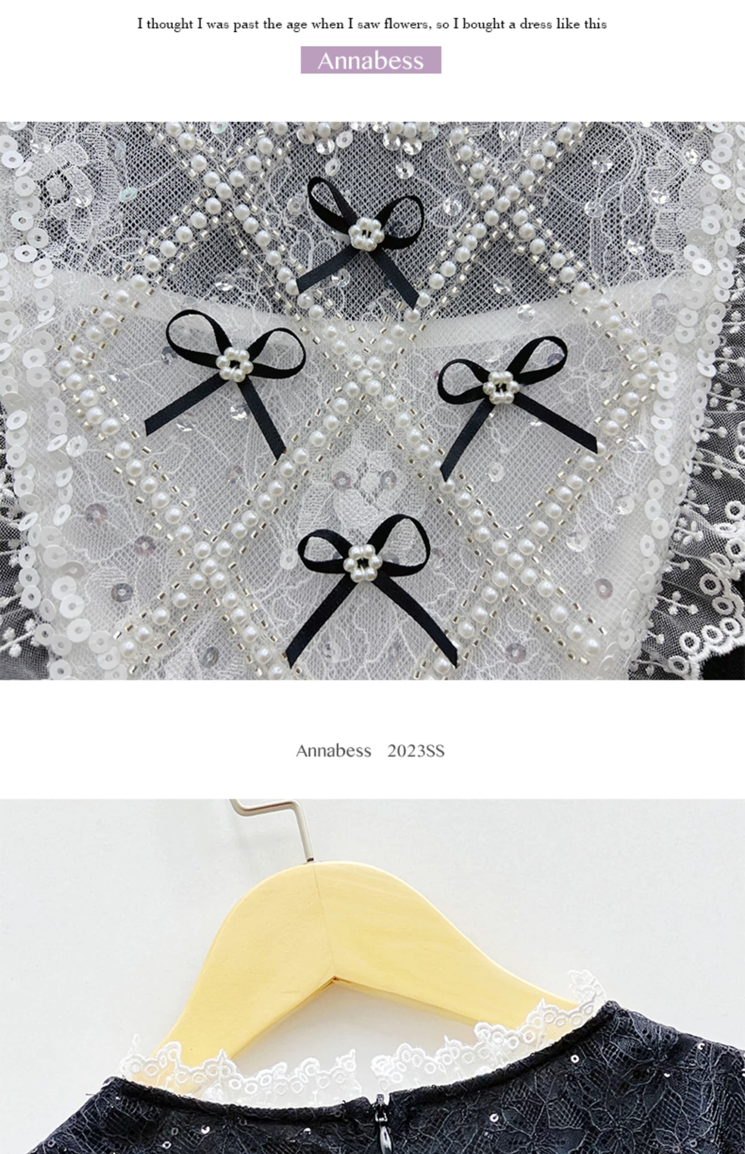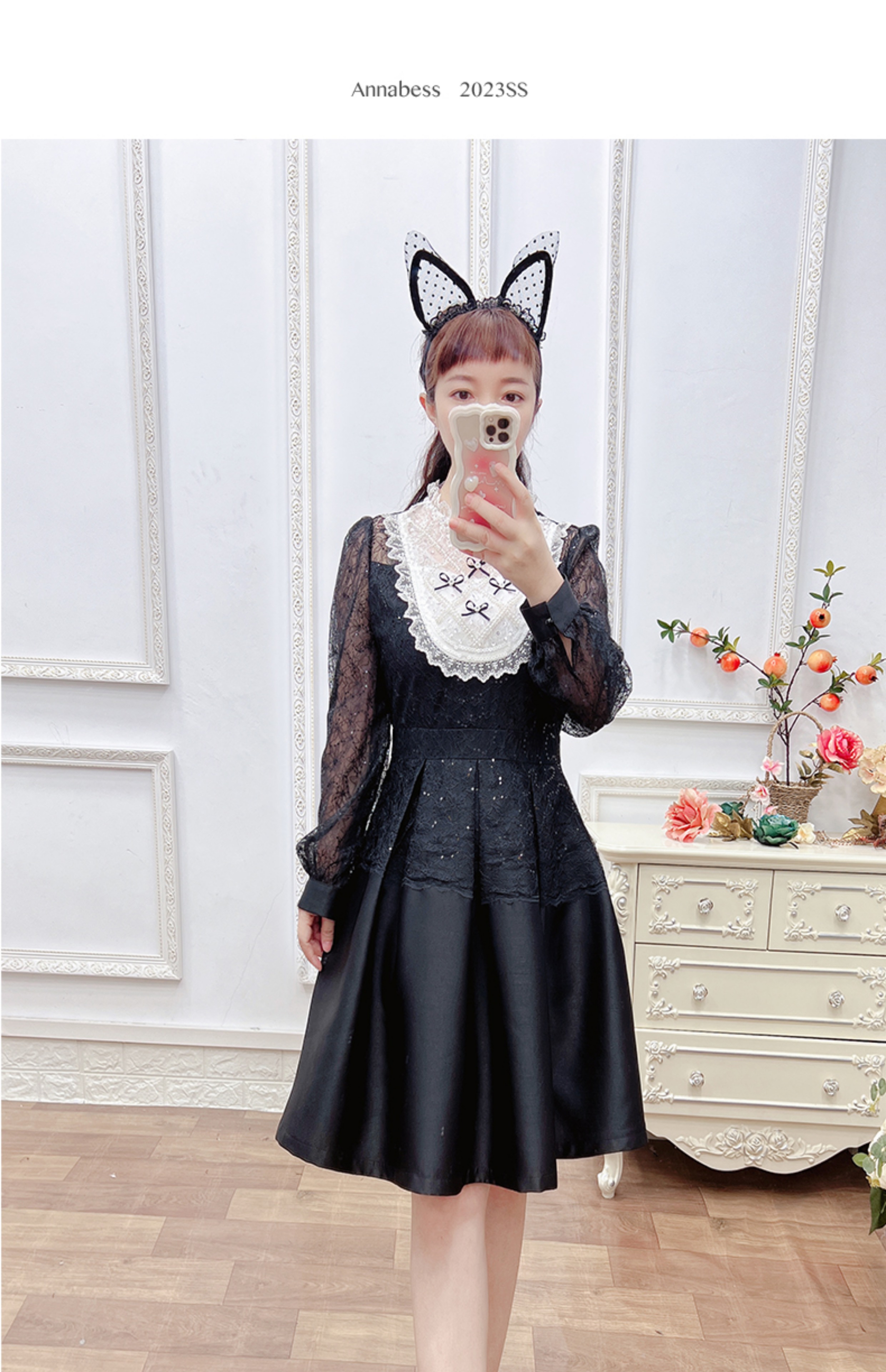 Annabess宮廷公主風禮服小黑裙珍珠蕾絲刺繡拼接燈籠袖收腰連衣裙