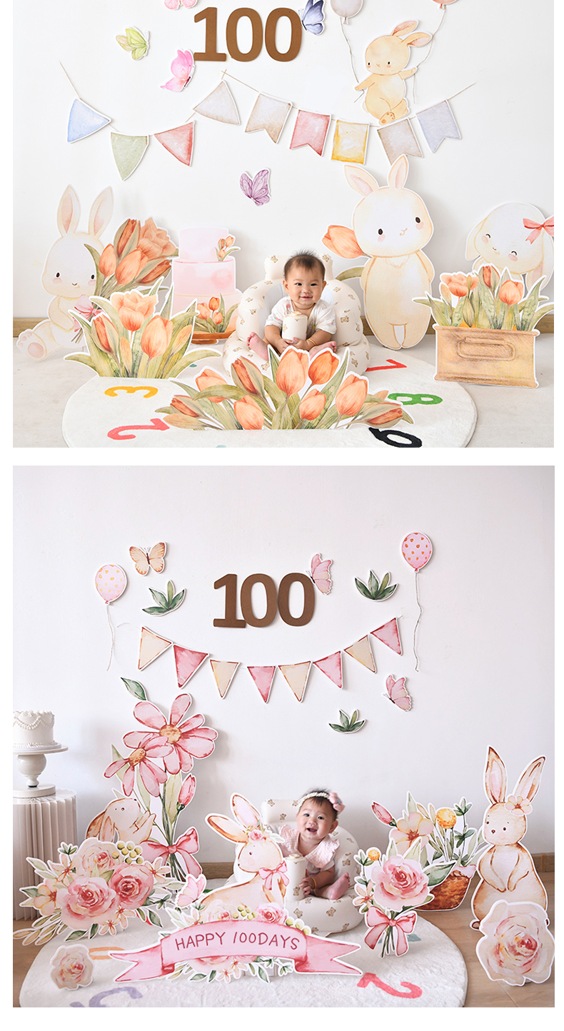 ins女寶周歲生日百天滿月雙滿月兔子kt板布置百日宴拍照場景裝飾