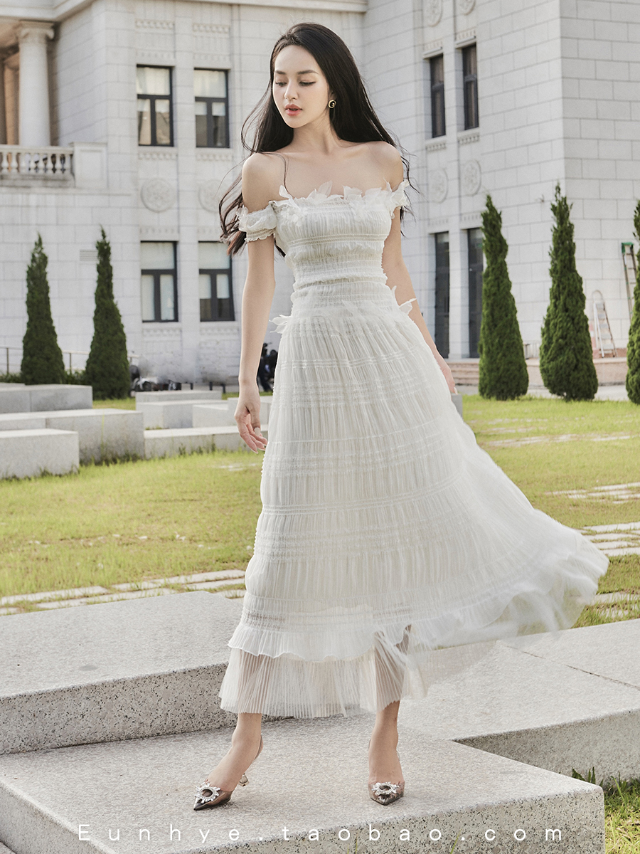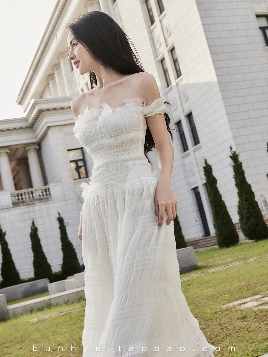 越南小眾品牌ROSIE 2023年夏季新款白色一字肩壓褶設計抹胸長裙