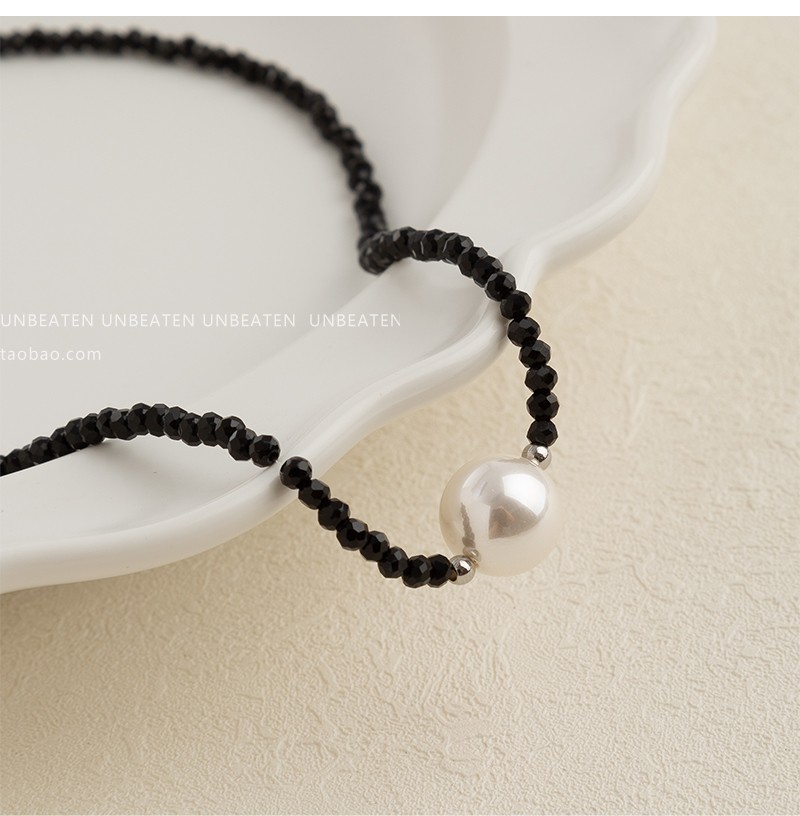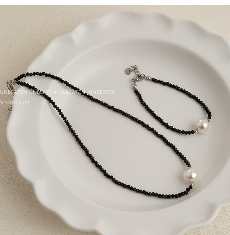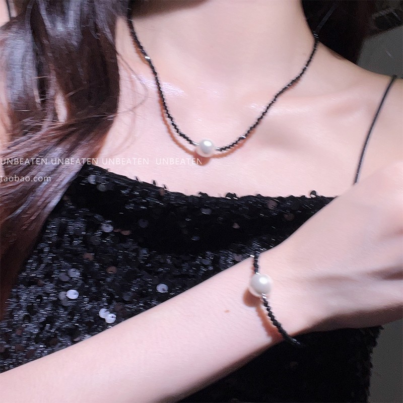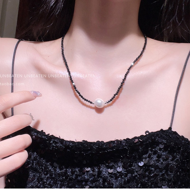 UNBEATEN黑色水晶珍珠項鏈女高級設計感小眾鎖骨鏈2023年新款爆款