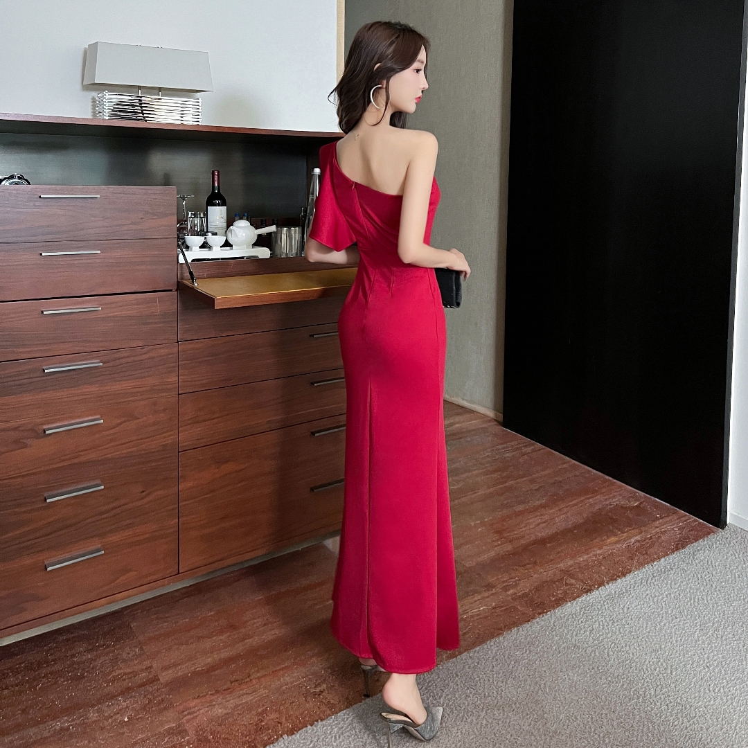 晚禮服氣質優雅荷葉邊斜肩修身包臀開叉長裙夜店性感酒紅色連衣裙
