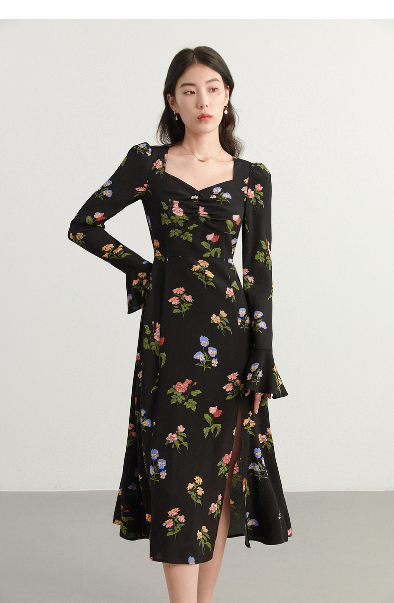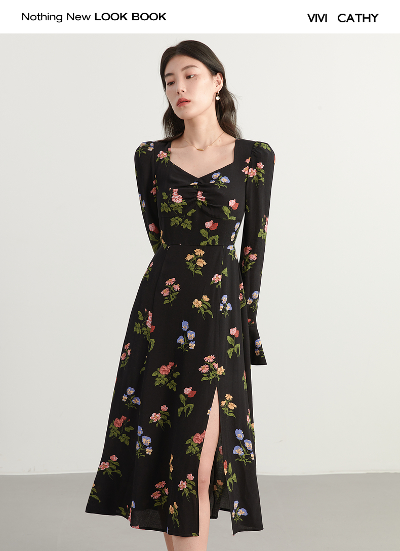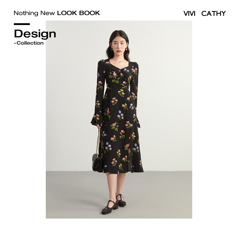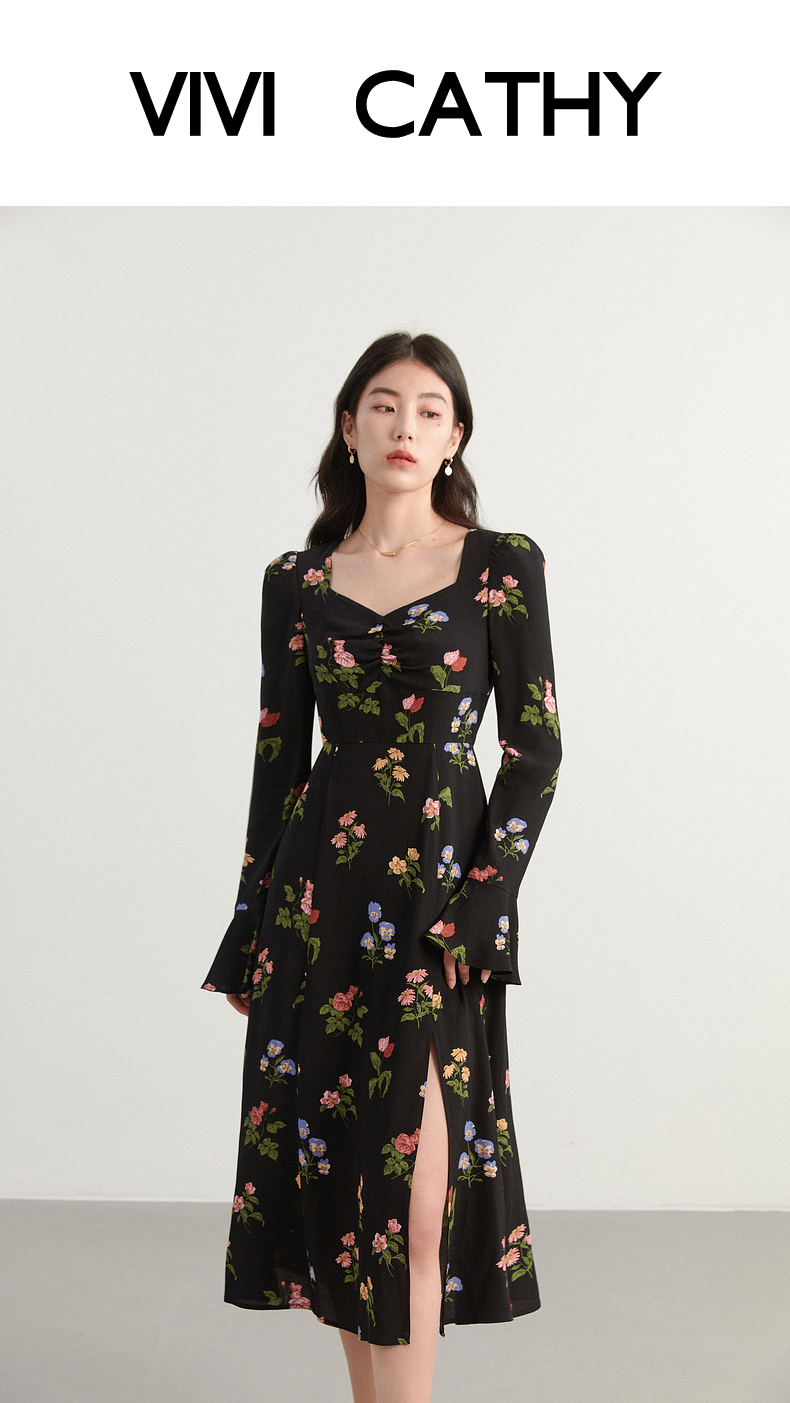 VIVICATHY2023大碼女裝秋喇叭袖連衣裙微胖MM修身印花長裙