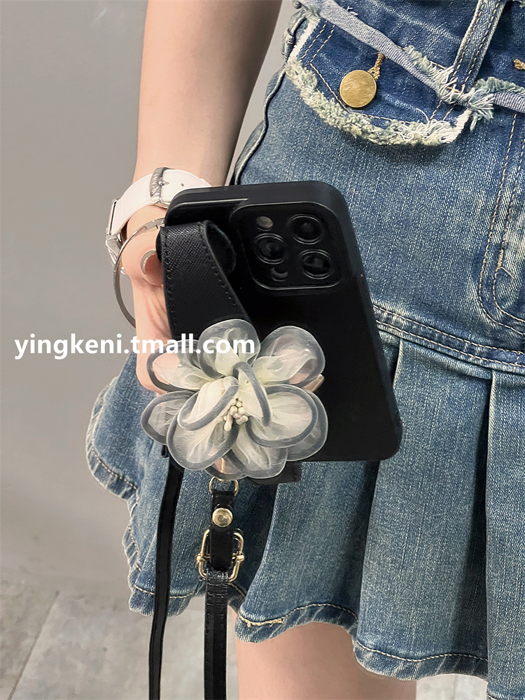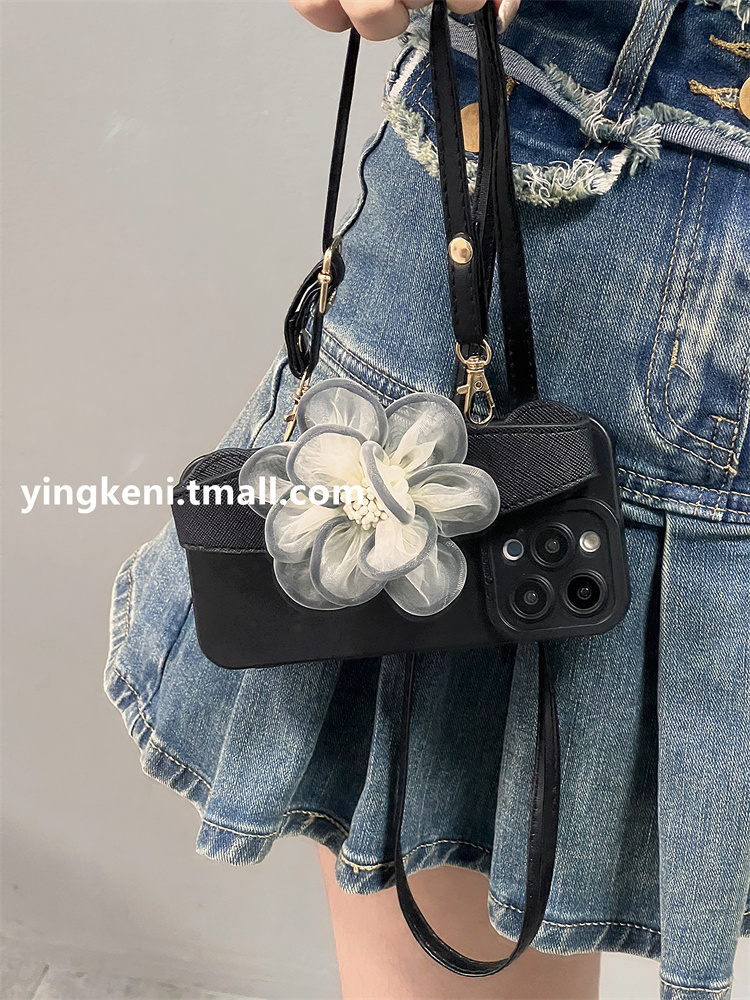 黑底絲巾花朵腕帶斜挎長掛繩iphone14promax手機殼蘋果14pro新款14蘋果13高級感12套全包ProMax防摔Pro女適用