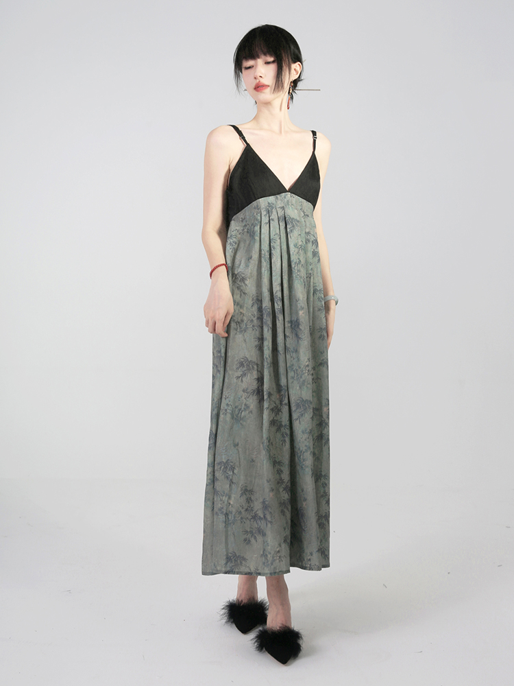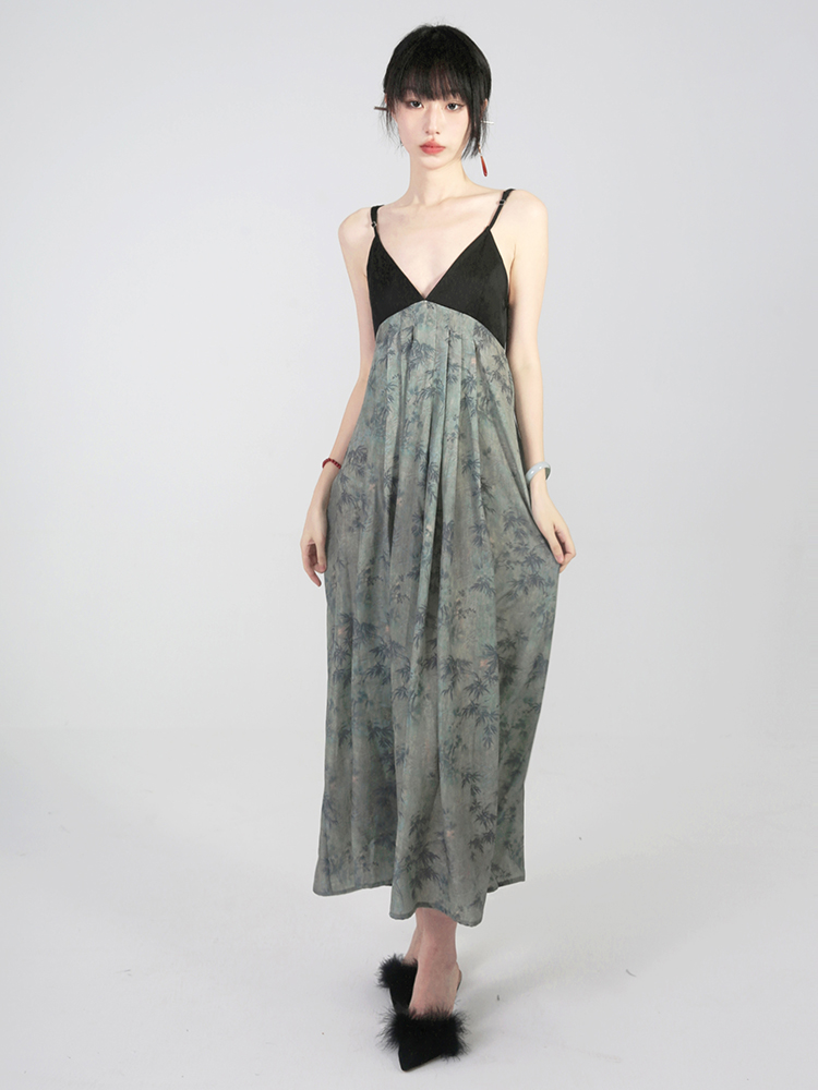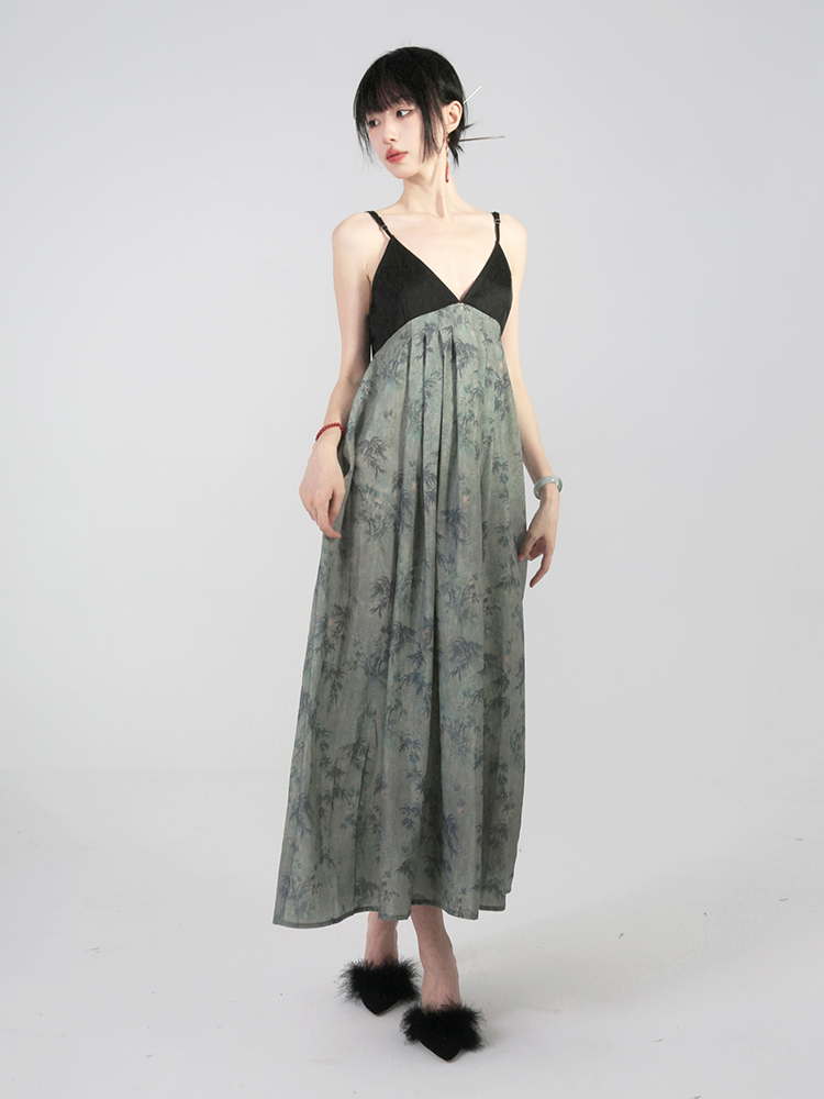 青田緒一【翻墨】2023年夏新中式國風長款過膝掛脖裙套裝女含內搭
