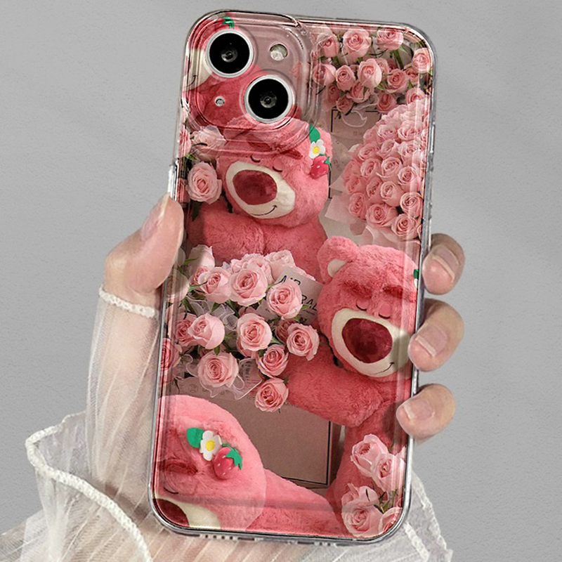 可愛玫瑰草莓熊適用蘋果14promax手機殼13pro少女12紅米k60華為p50軟nova9榮耀70女vivox80全包oppoa72保護套