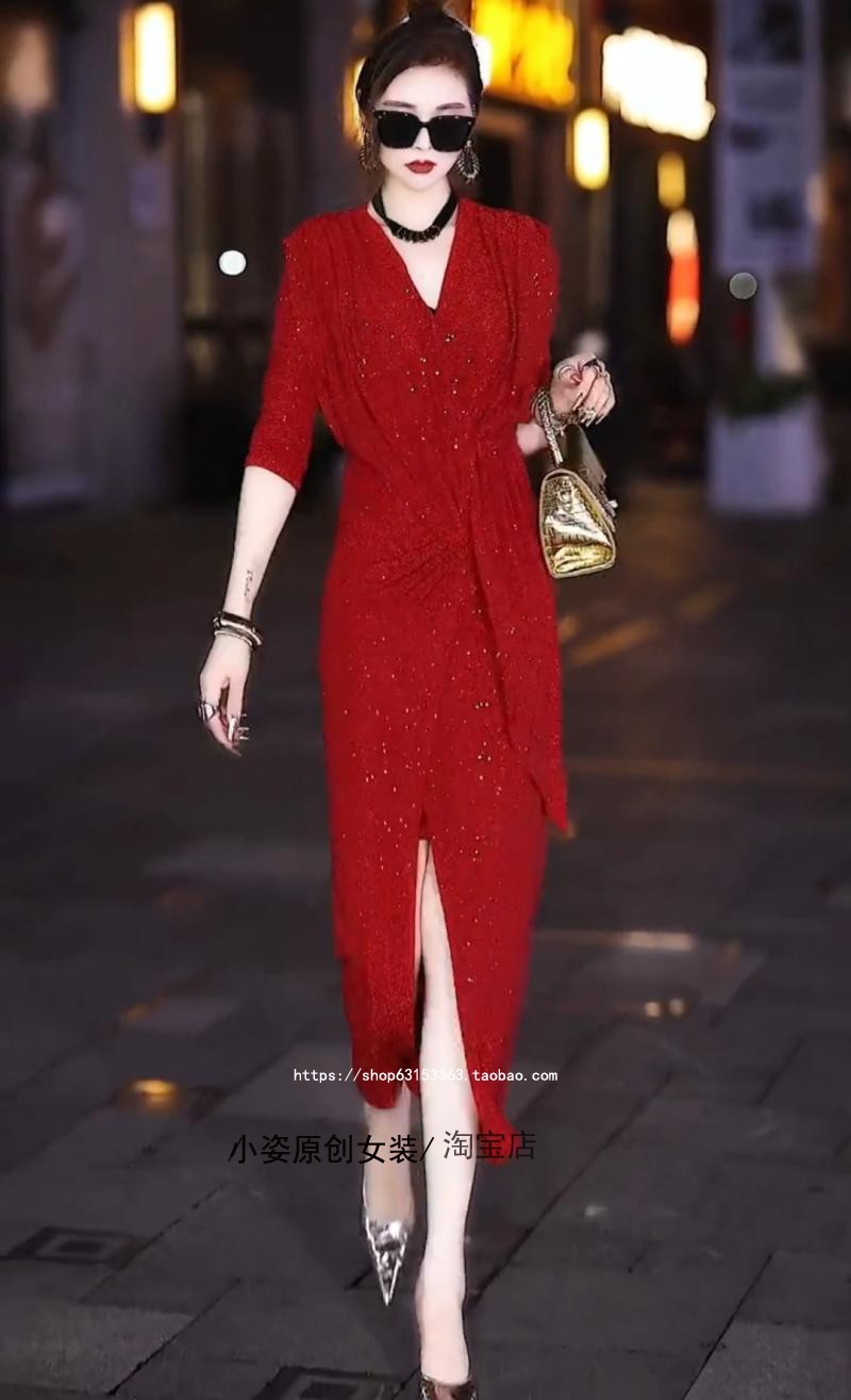 正版名媛禮服高定輕奢珠光優雅氣質秋款彈力亮絲遮肚子長款連衣裙