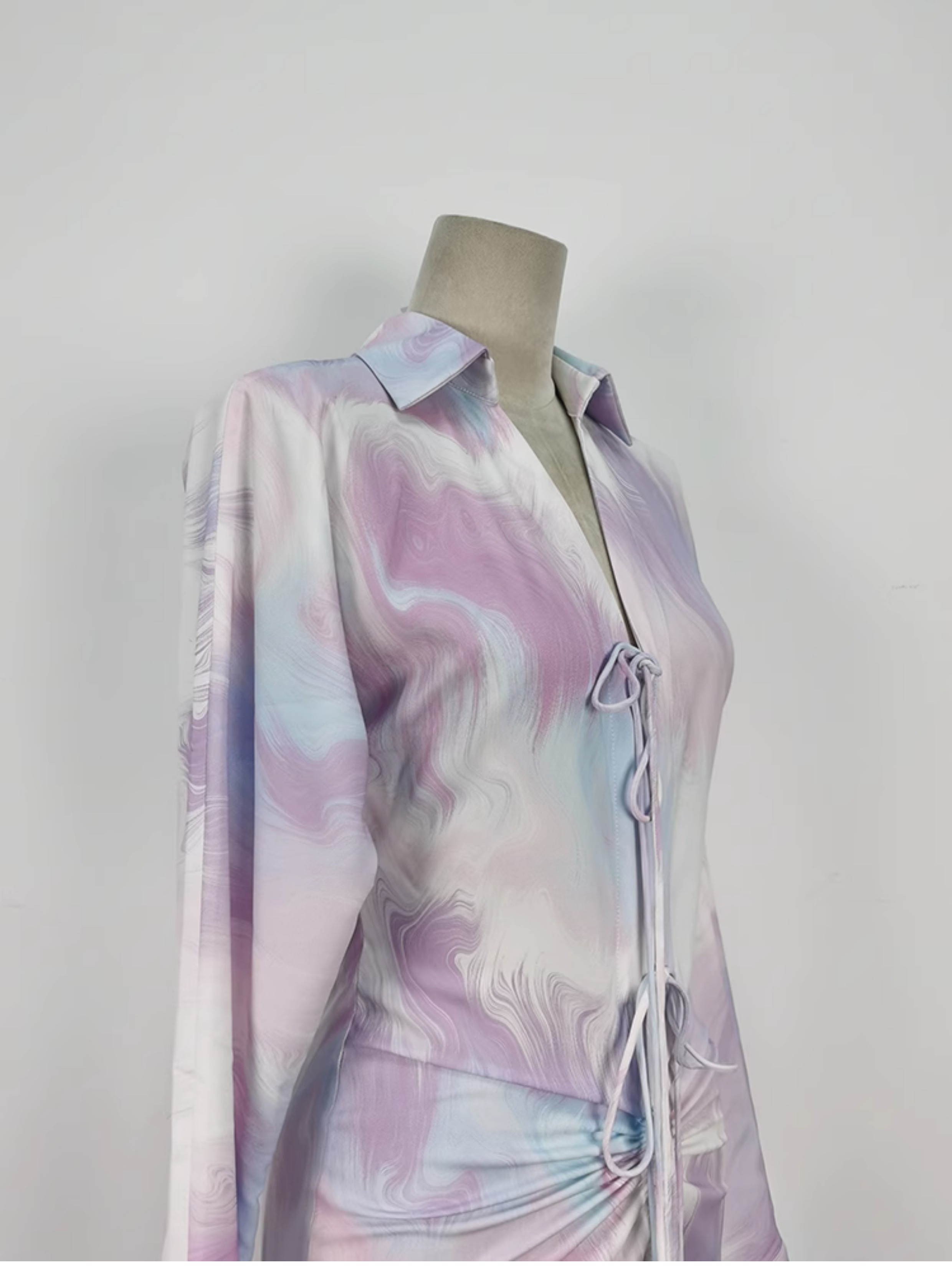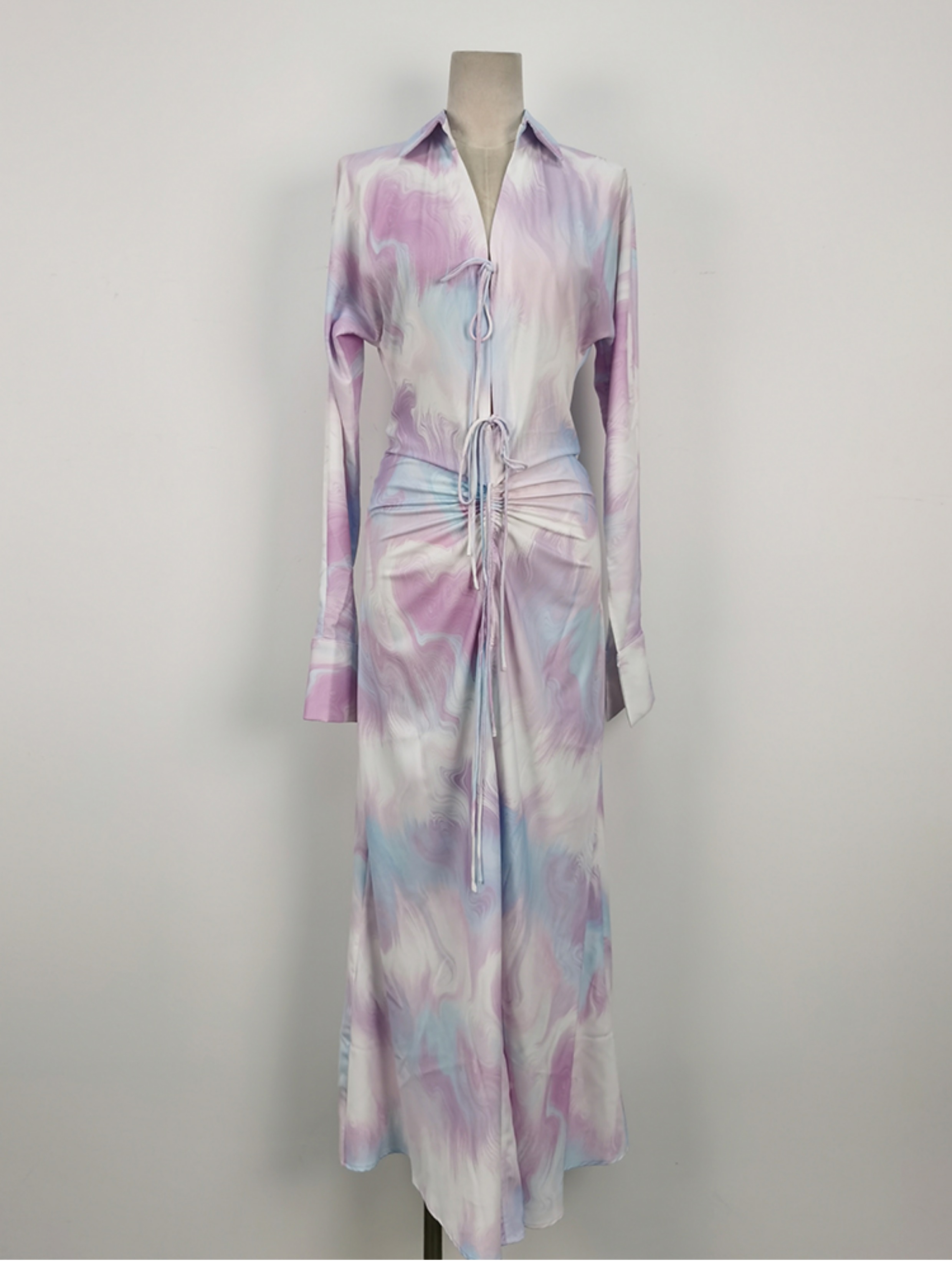 越南設計師氣質抽繩收腰v領長袖紫色印花長裙女小眾慵懶范連衣裙