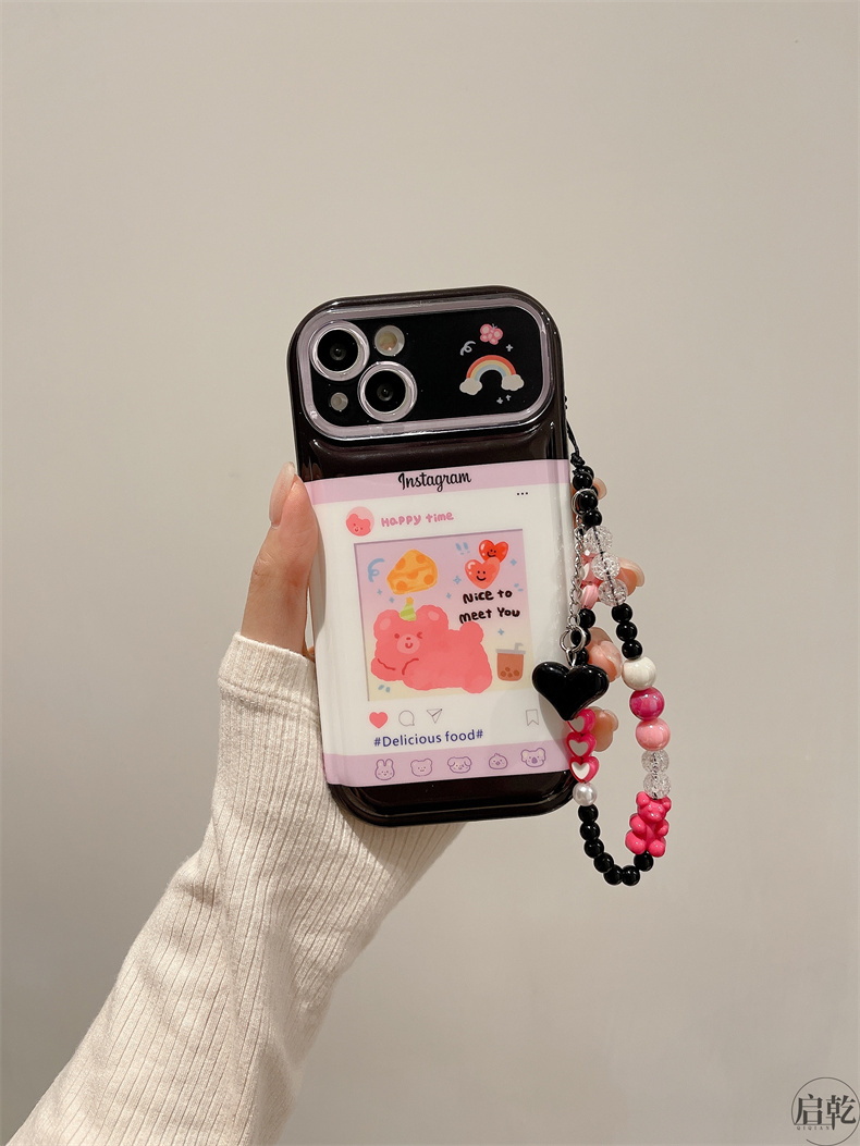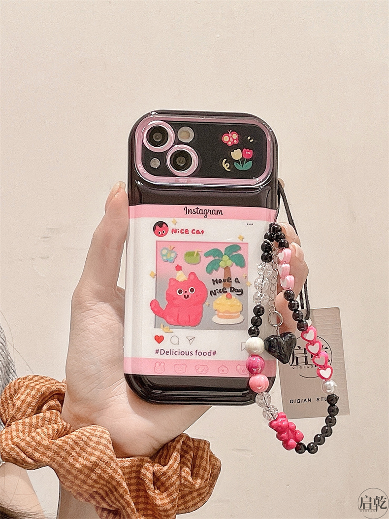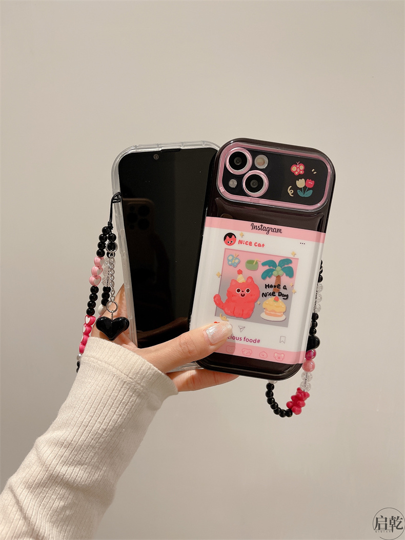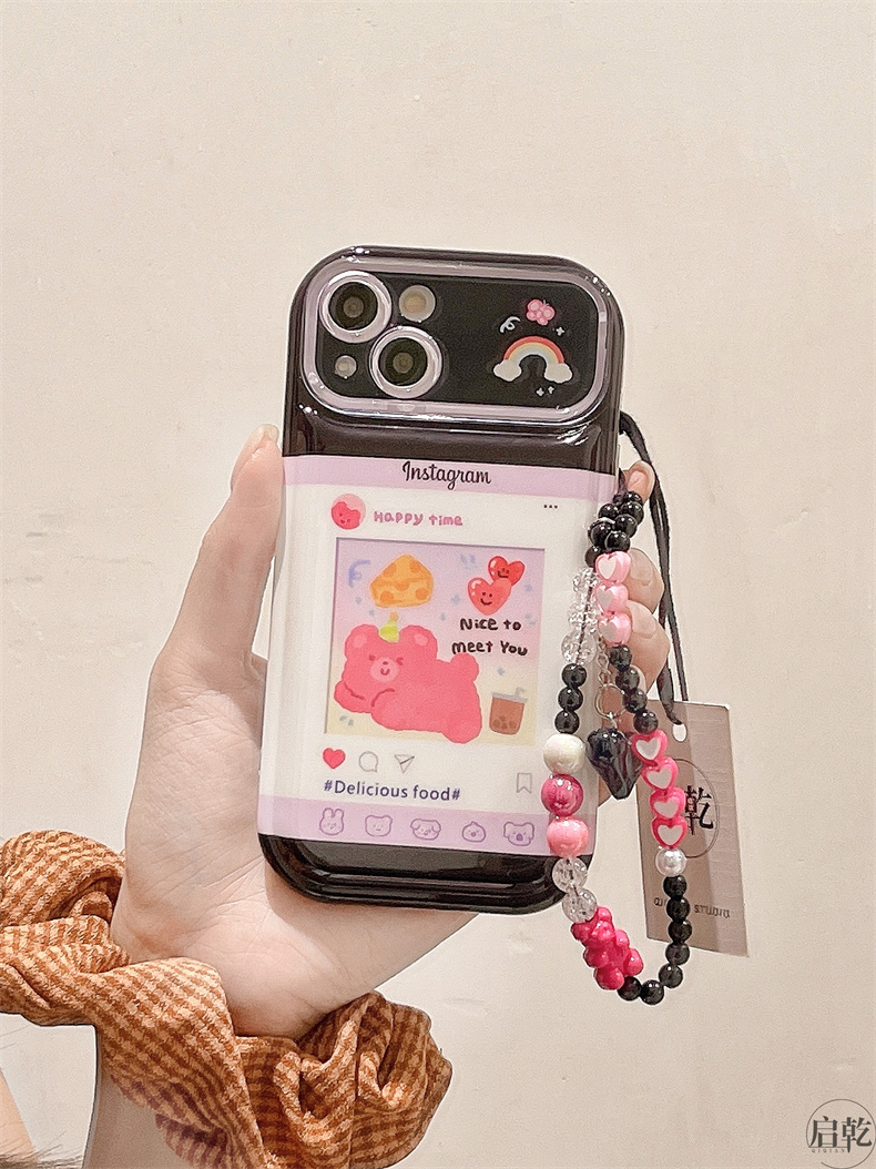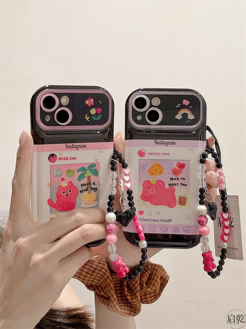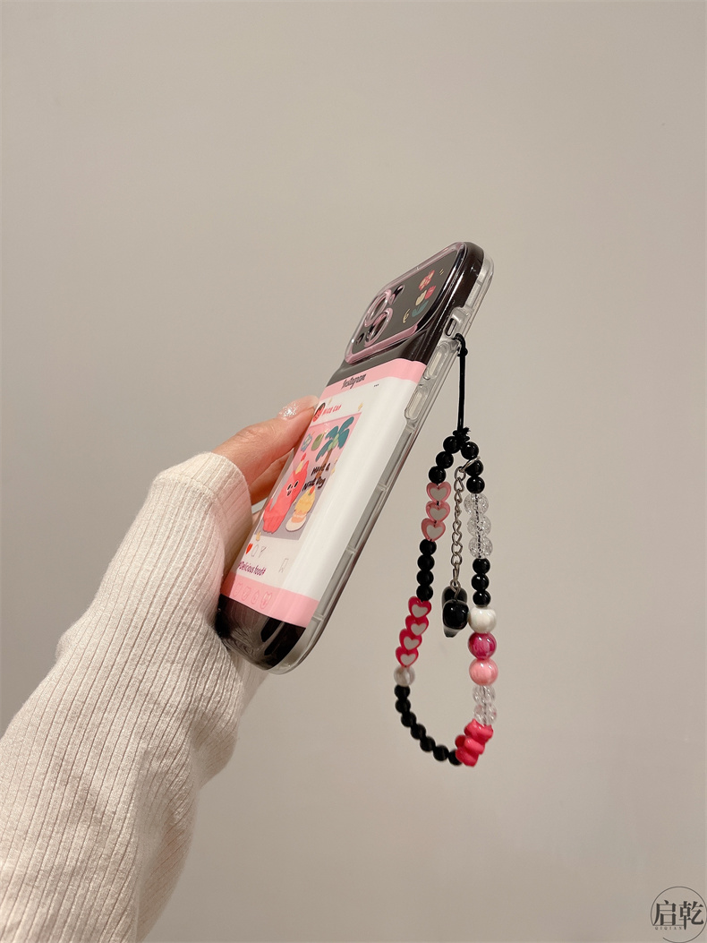 啟乾 可愛動漫卡通手腕帶iPhone14手機殼適用蘋果13promax皮質軟殼12/11可拎鏈條掛繩手腕繩少女心新款粉色