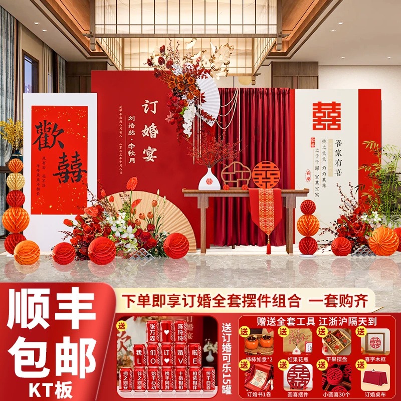 訂婚布置裝飾全套擺件擺臺kt板中式背景墻套餐定親宴結婚禮迎賓牌