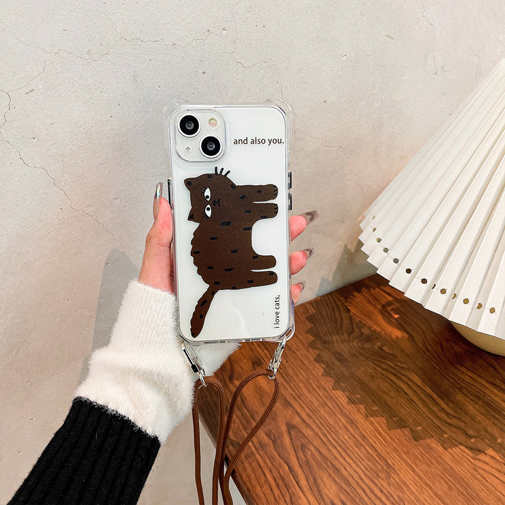 咖啡色貓四角開孔可斜挎掛繩手機殼14pro掛繩背帶可調節替換iphone13promax適用11XR透明防摔掛脖小眾保護殼